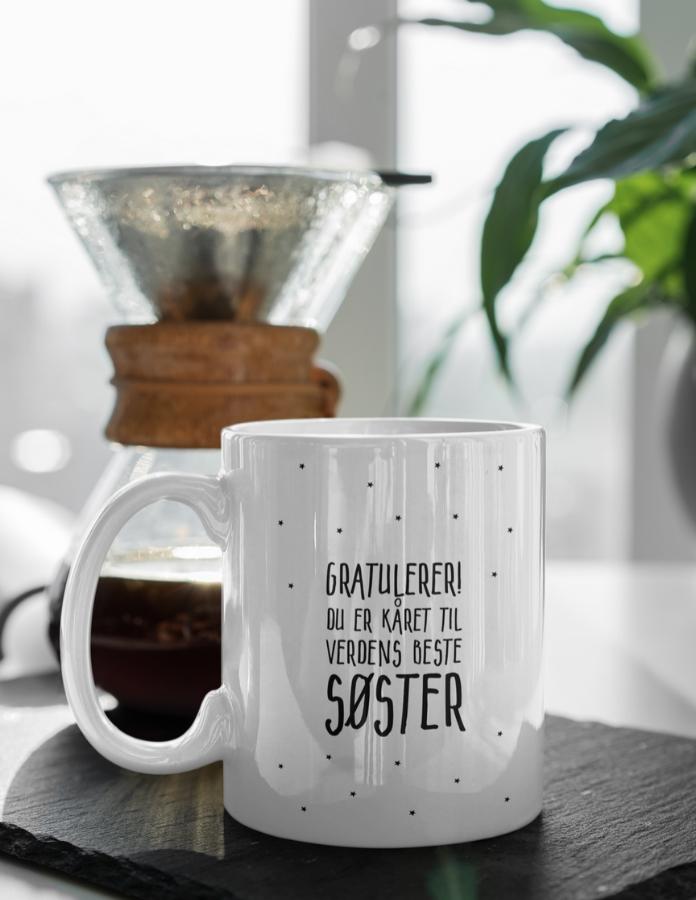 Koselig krus med teksten "Gratulerer! Du er kåret til verdens beste SØSTER".