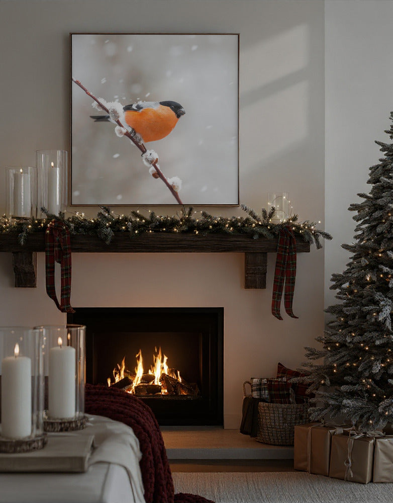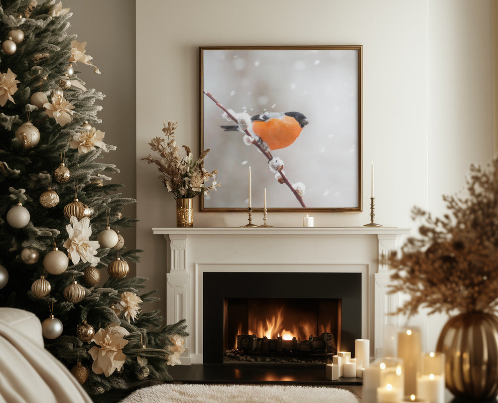 Bullfinch in a snowstorm. av Annie Keizer. Kan kjøpes som plakat eller lerret.