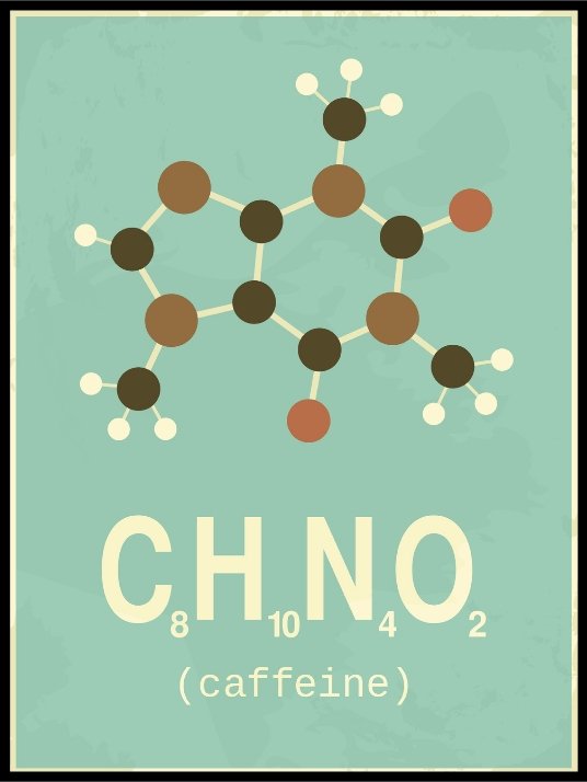 En kul plakat til kjøkkenet som viser molekylet til koffein. Posteren har grønn bakgrunn.