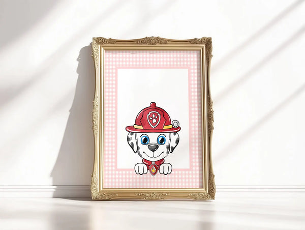 Marshall er alltid klar for action! Denne søte plakaten med den modige brannhunden fra Paw Patrol passer perfekt på barnerommet. Med sin røde brannhjelm og vennlige smil sprer Marshall både trygghet og glede. Heng plakaten alene, eller kombiner den med flere av karakterene for å skape en hel Paw Patrol-vegg. Trykket på kvalitets fotopapir med klare farger som varer.
