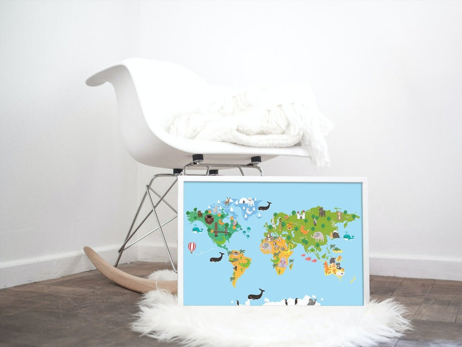 Stilig verdenskart til barn. Her kan de lære om hvordan verden ser ut med søte illustrasjoner og tegninger av dyrene som lever i de forskjellige verdensdelene.