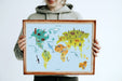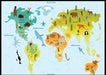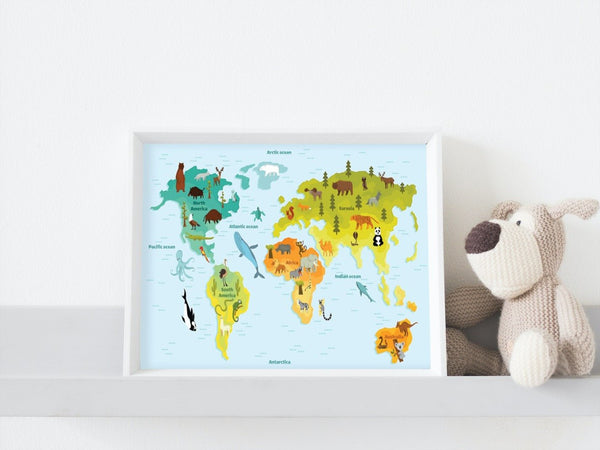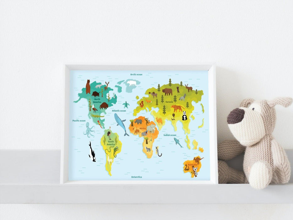 Stilig verdenskart til barn. Her kan de lære om hvordan verden ser ut med søte illustrasjoner og tegninger av dyrene som lever i de forskjellige verdensdelene.