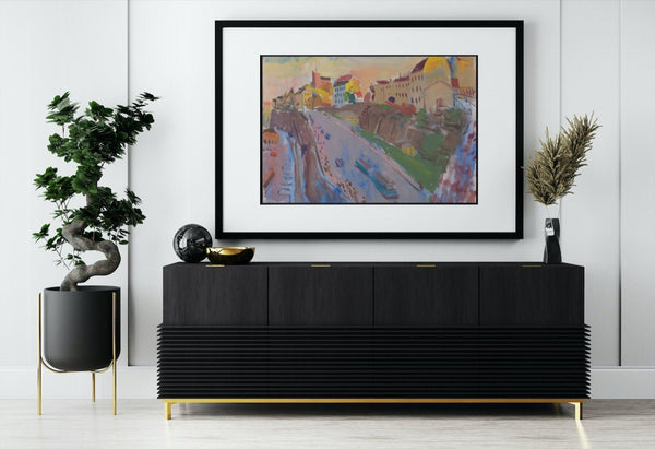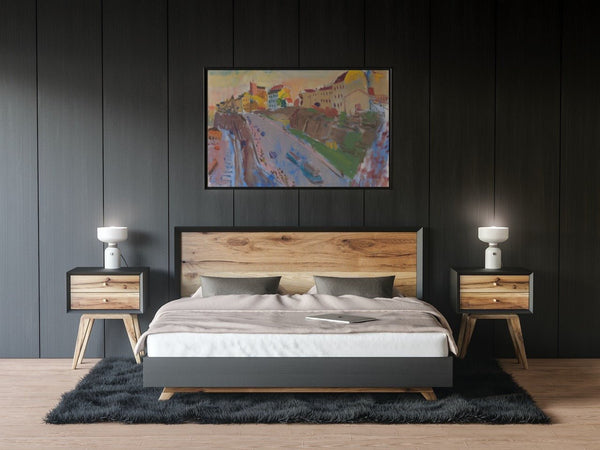 - Etter printing spennes lerretsduken på en kraftig blindramme. For de fleste formatene bruker vi en 40mm tykk ramme, slik at det oppnås en flott dybde-effekt når rammen henges på veggen. Deretter monterer vi på oppheng med stålvaier og kunstverket ditt kan henges rett på vegg.