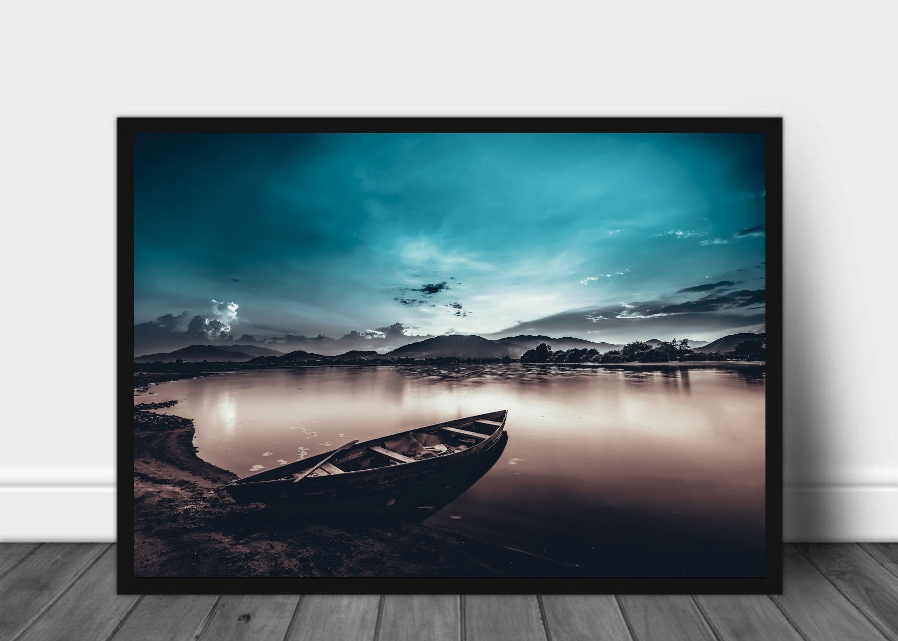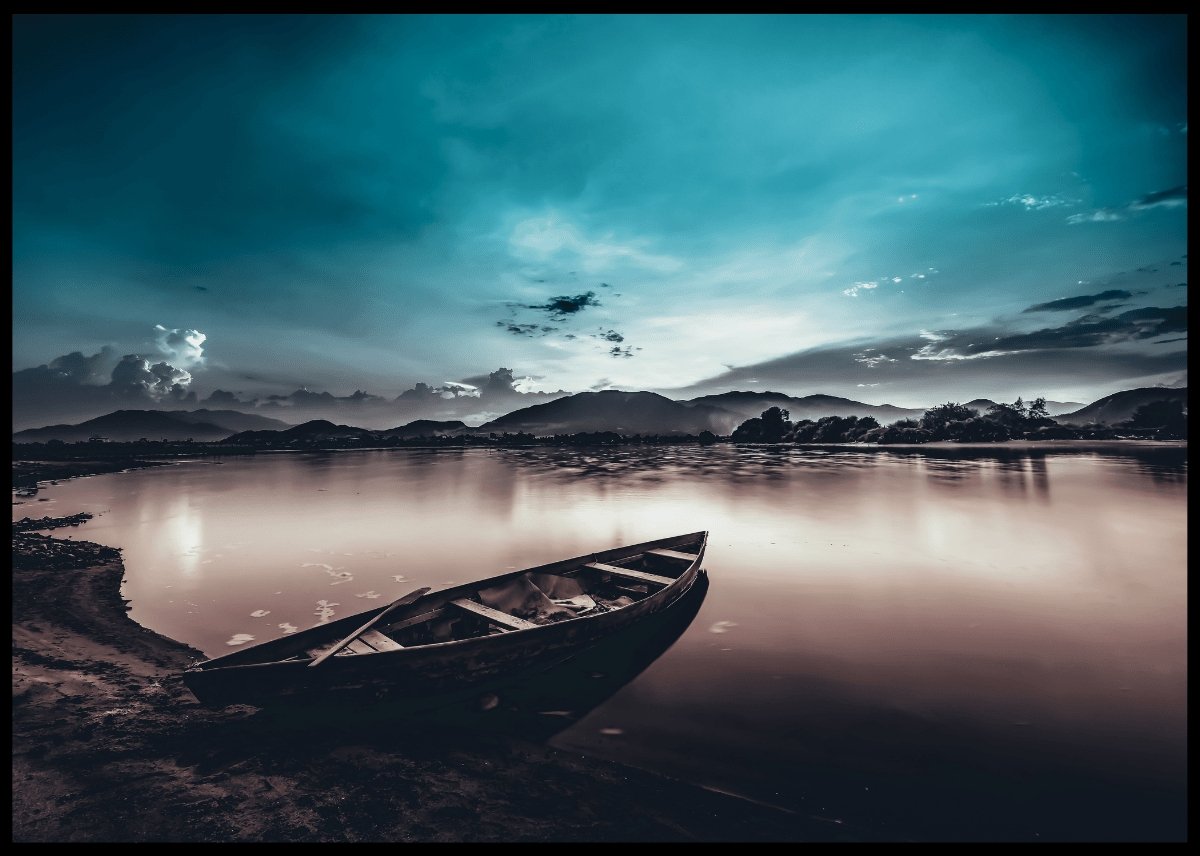 Nydelig naturplakat med gammel robåt som ligger i vannet.