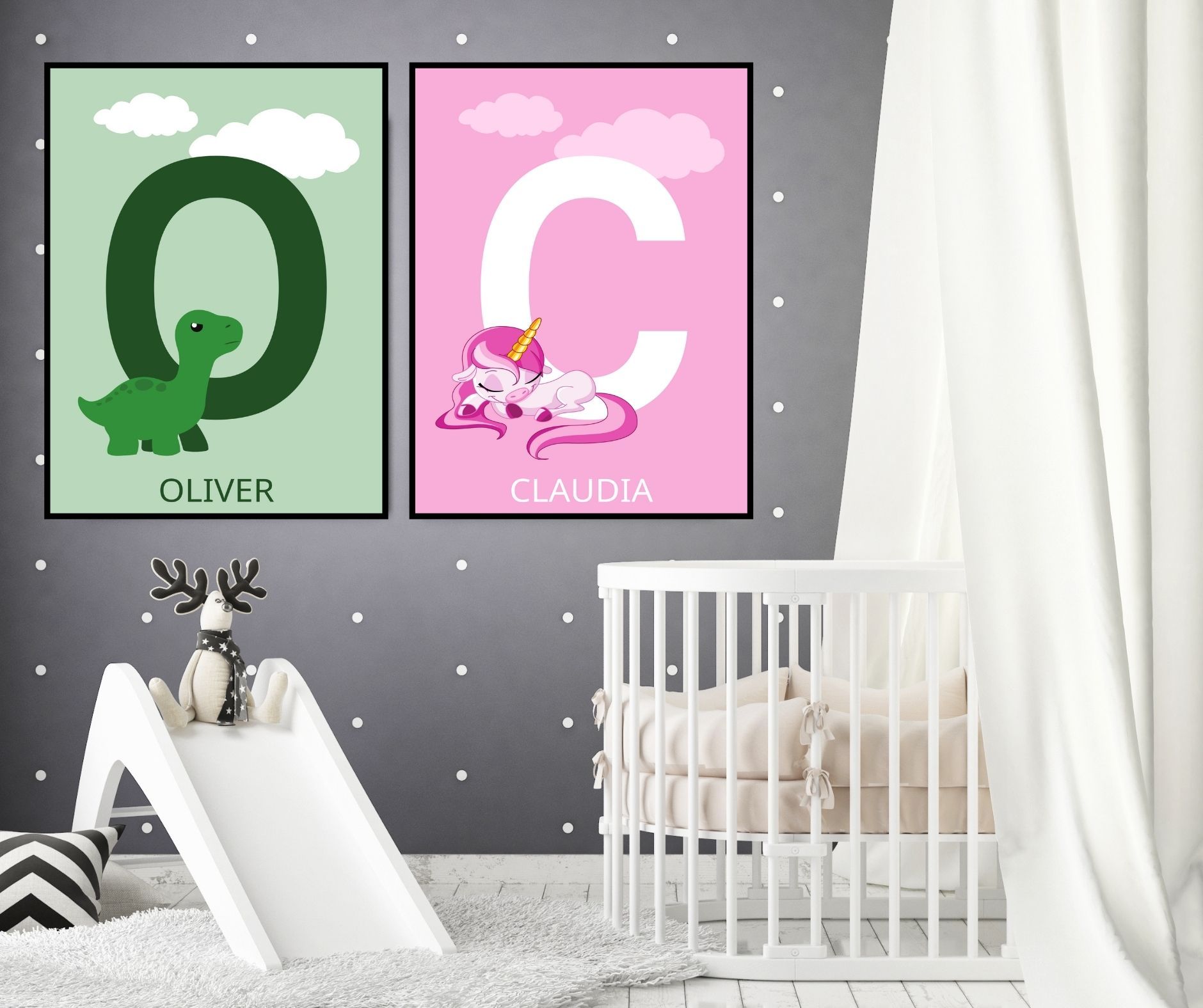 Søt bokstavplakatplakat med grønn bakgrunn, barnets første bokstav og navn.