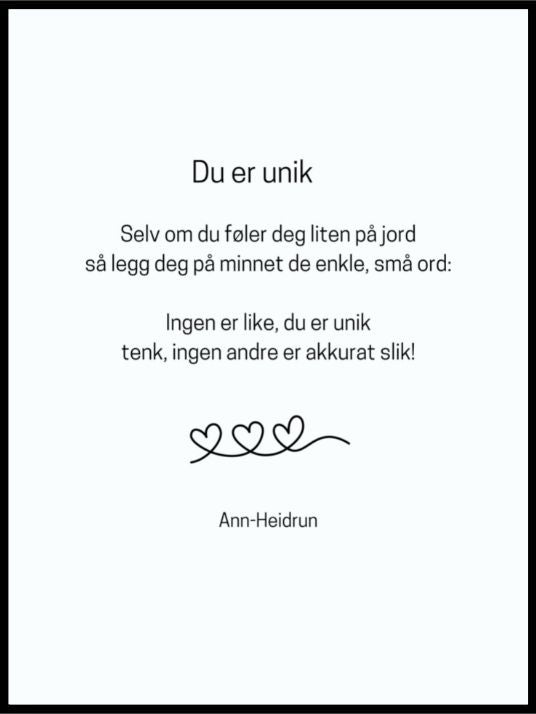 Et flott dikt av Ann-Heidrun som handler om at vi alle er unik.  En fin gave å gi bort.