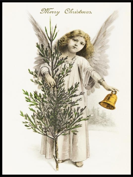 Gammeldags juleplakat av engel som holder rundt et juletre og i en bjelle.