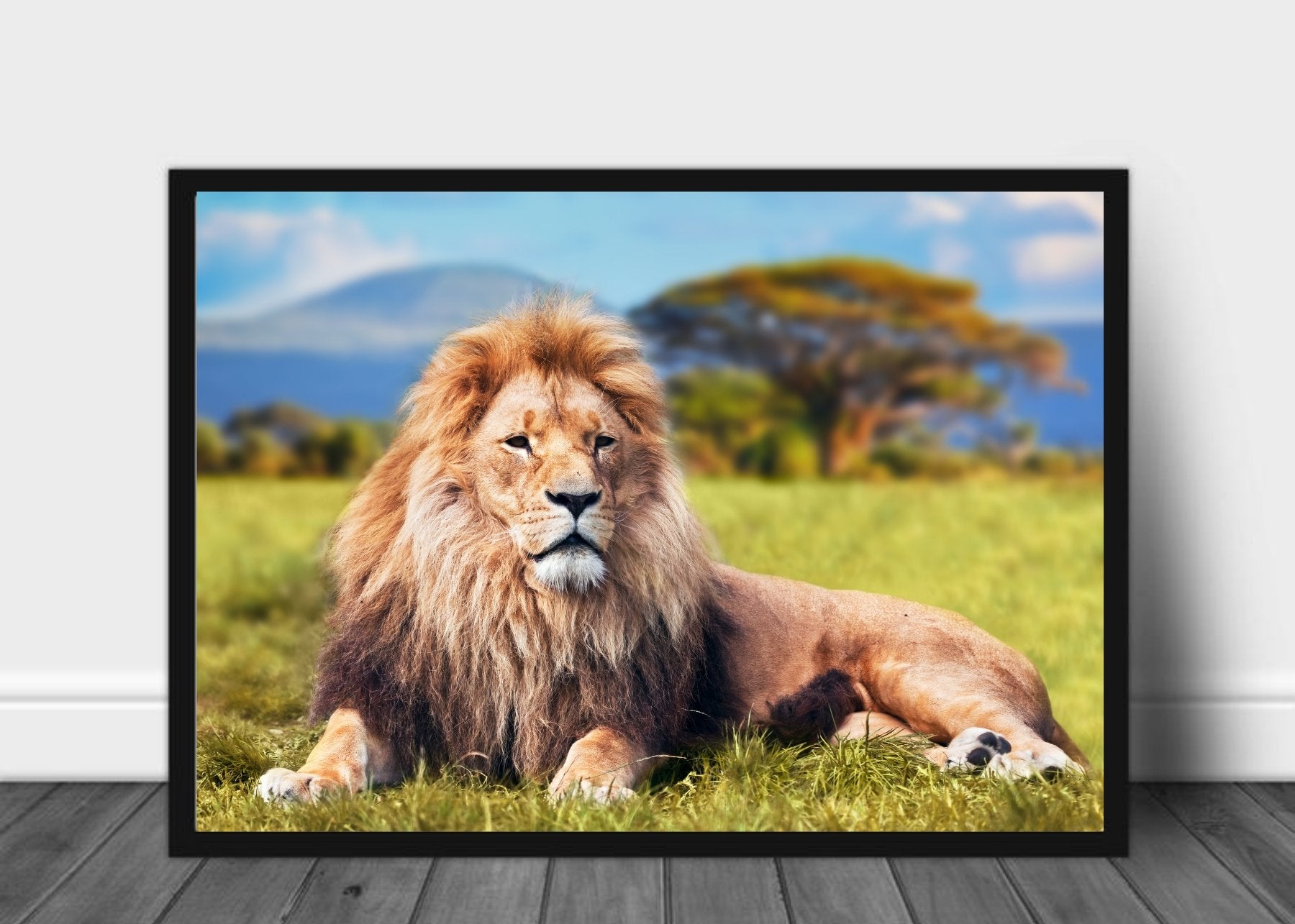 Poster av hannløve i flott afrikansk landskap