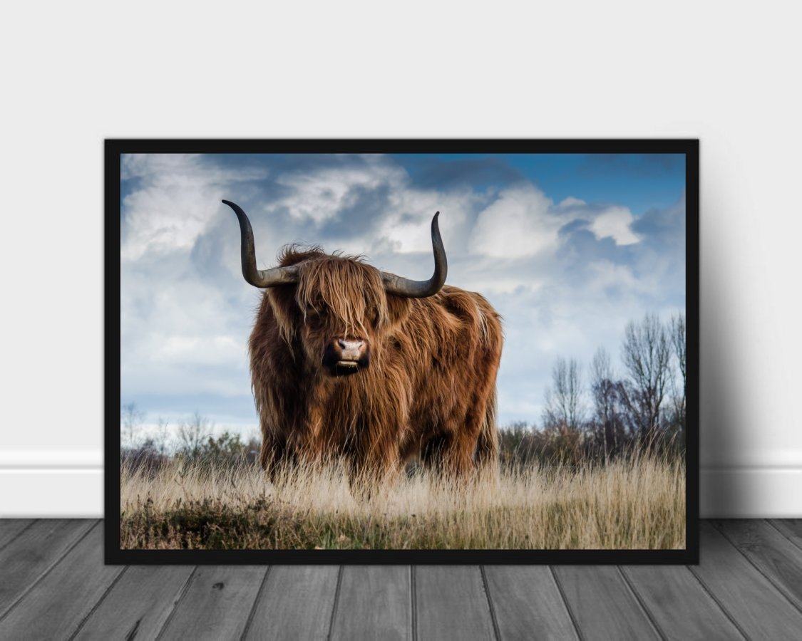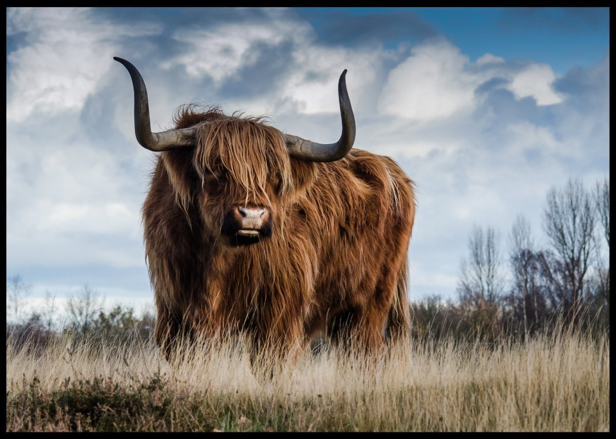 Plakat av en flott okse med store horn i nydelige omgivelser.
