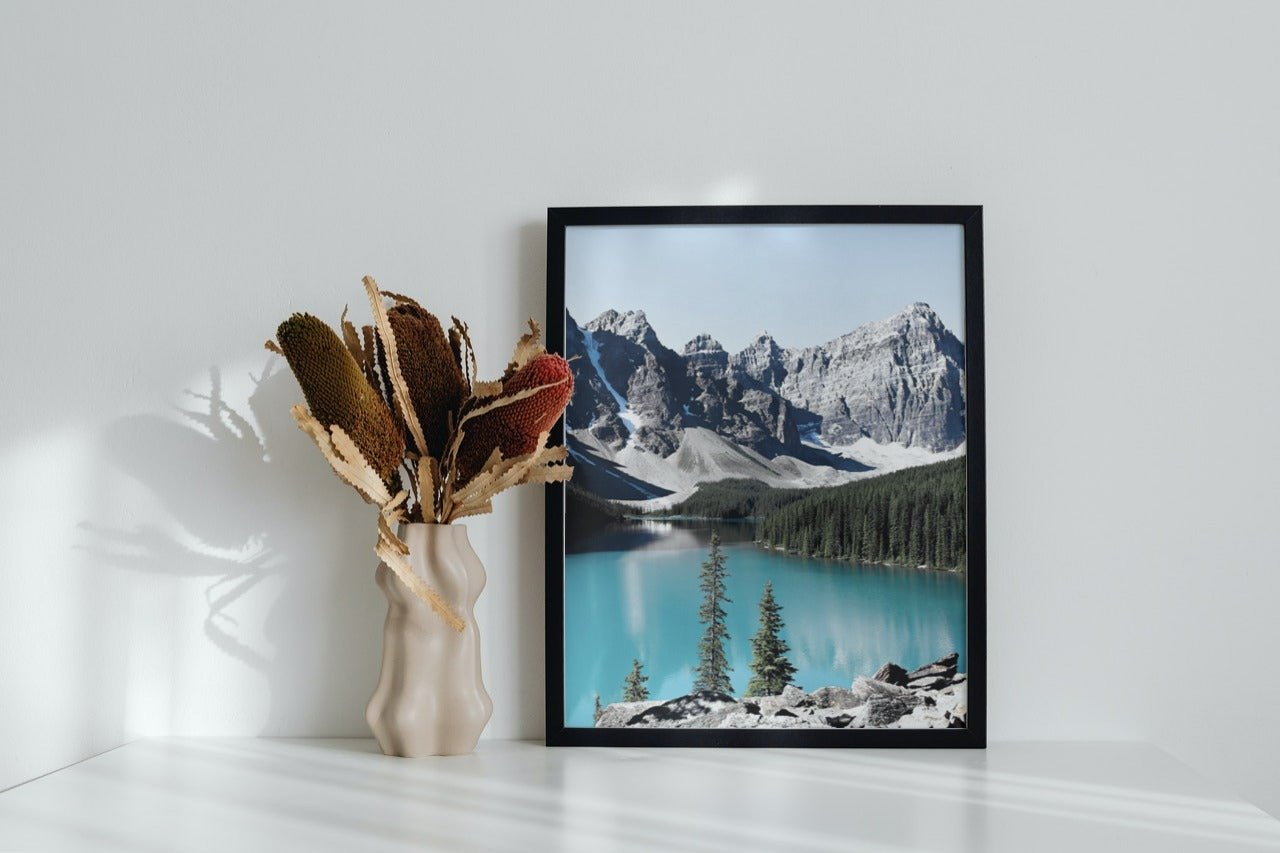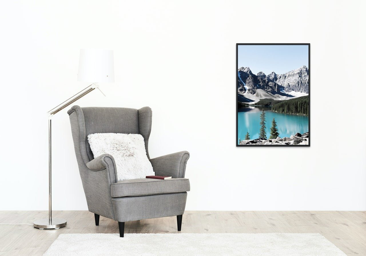 Plakat med motivet "innsjø mellom fjell" gir et avslappende inntrykk. Nydelig motiv med speilbilde av snødekte fjell i vannet.
