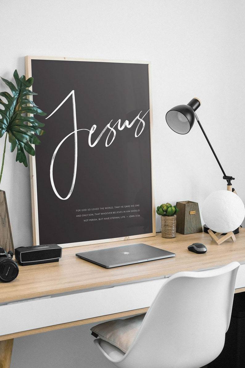 Fin typografiplakat med navnet Jesus og John 3:16 - "For God so loved the world, that he gave his one and only Son, that whoever believes in him should not perish, but have eternal life.