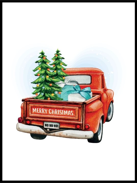 En nydelig juleplakat av håndmalt julebil med skjønne juledetaljer.