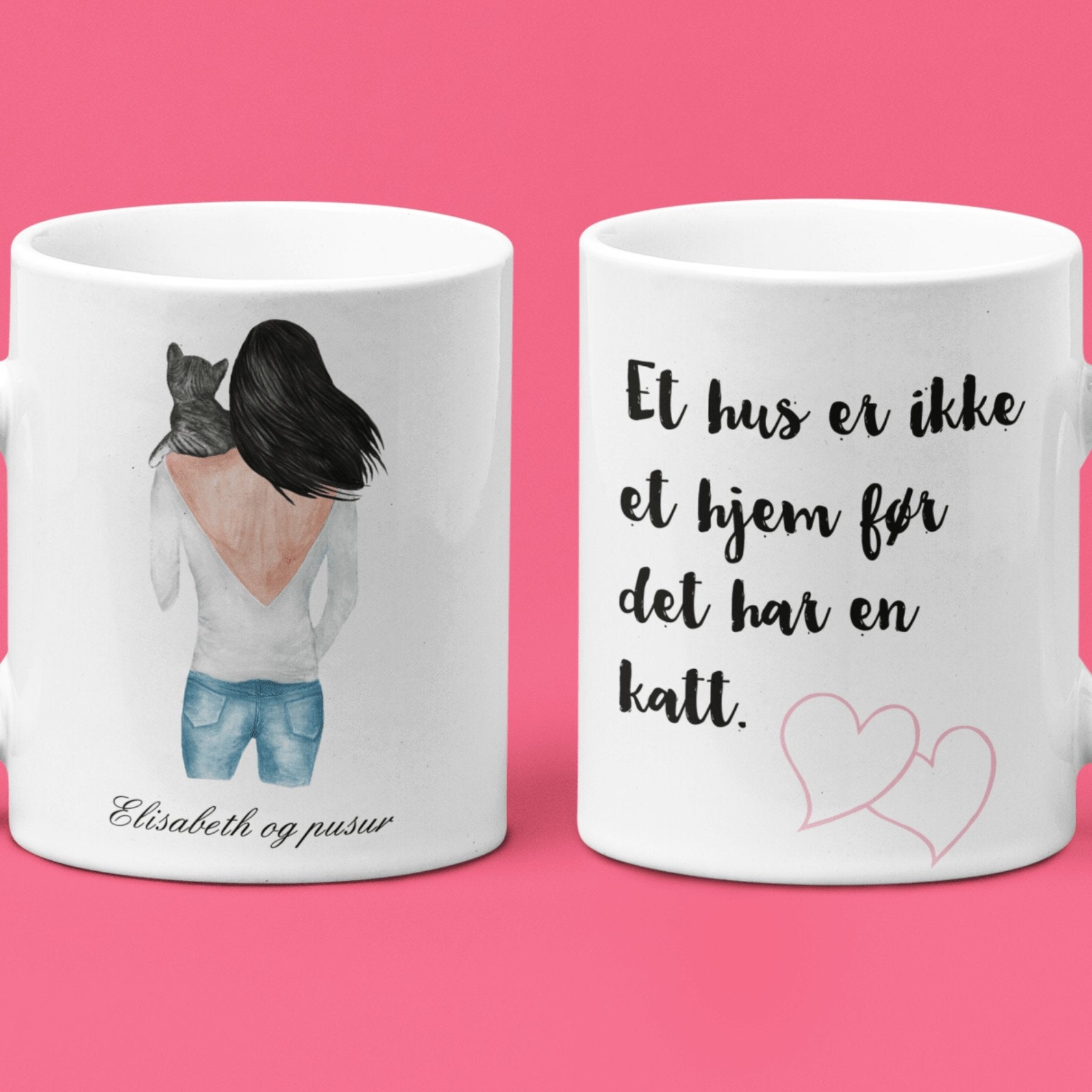 Morsom og personlig kopp til en katteeier. Velg blant flere kattetyper og hårfarger på kvinnen. Skriv selv inn navnet på katten under illustrasjonen.