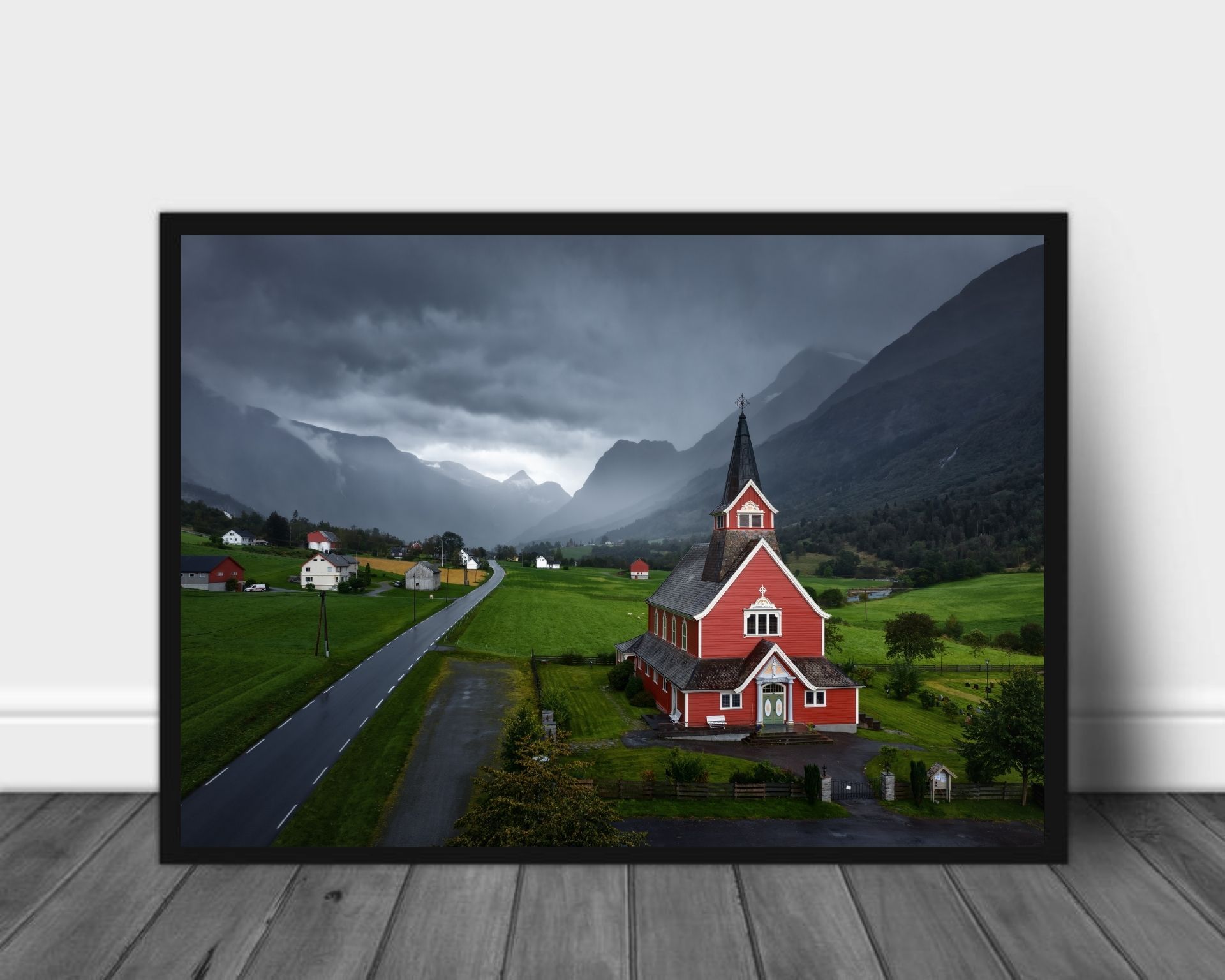 Plakat av en nydelig rødmalt kirke i et norsk bygdelandskap