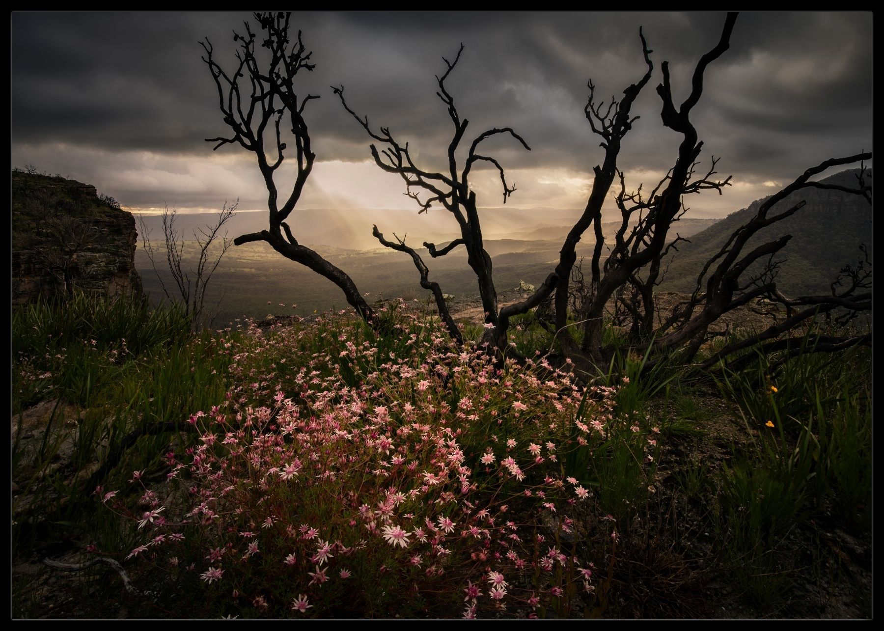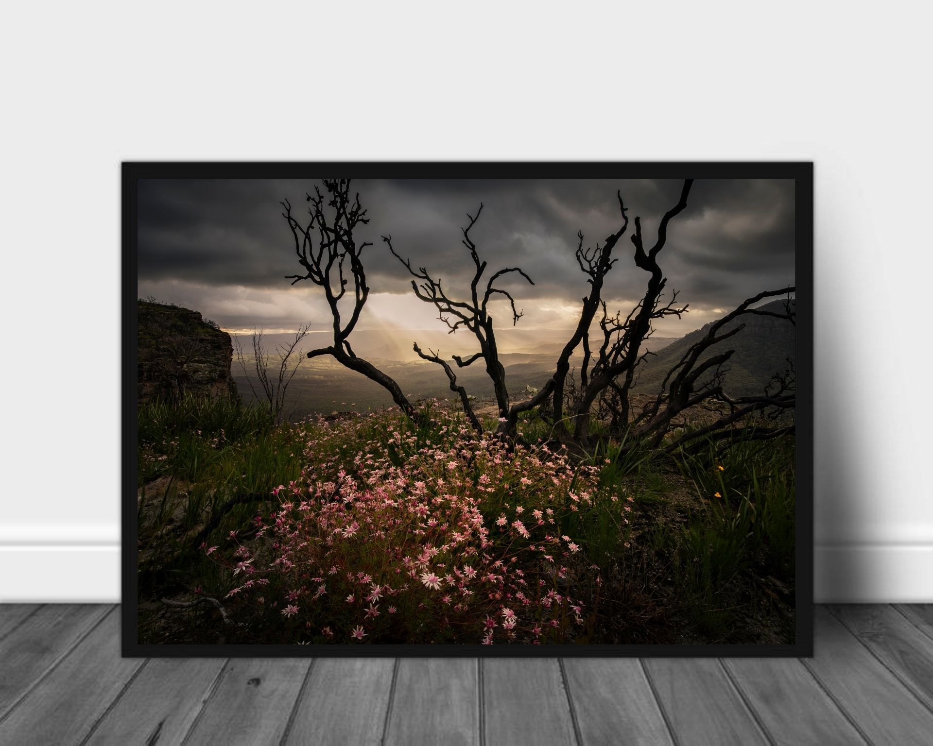 Plakat av krokete trær og blomsterprakt mot en stemningsfull himmel.
