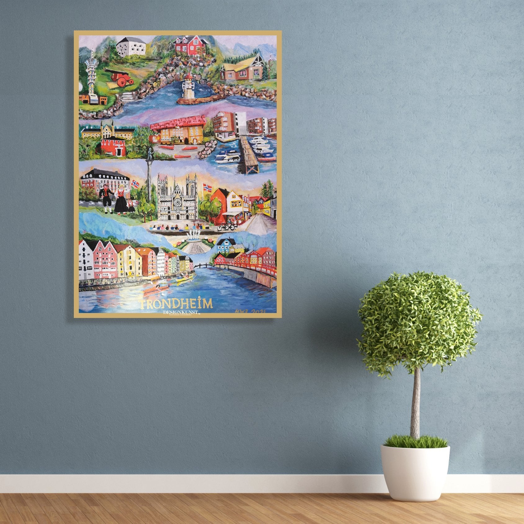 Illustrert tolkning av Trondheim malt av den danske kunstneren Hanne Jørgensen, med den vakre naturen og storslåtte historien. Her er vår første Norge-plakat som moderne plakatkunst. Illustrert i moderne fremtidssikre farger som passer inn i de fleste hjem og gjør alle hjem en tjeneste uten å fjerne fokus fra interiøret.