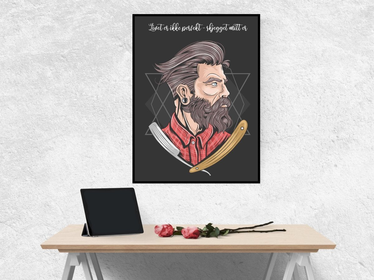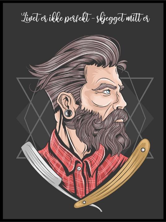 Posteren har teksten "Livet er ikke perfekt - skjegget mitt er" og et trendy motiv av en skjeggete mann.