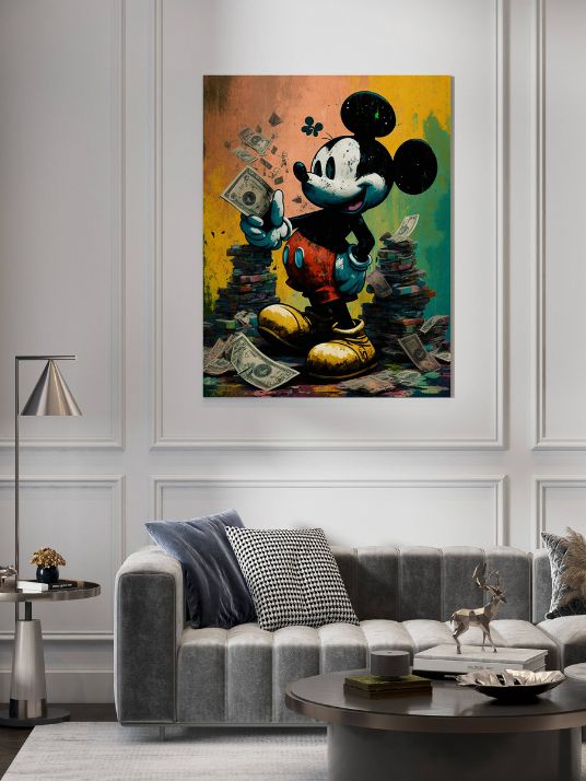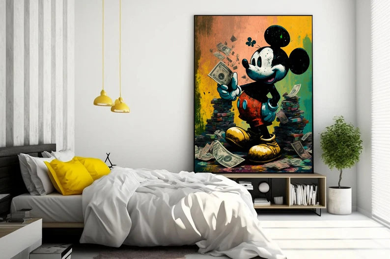 Kunstnerisk trykk av Mikke Mus med penger. Banksy stil.