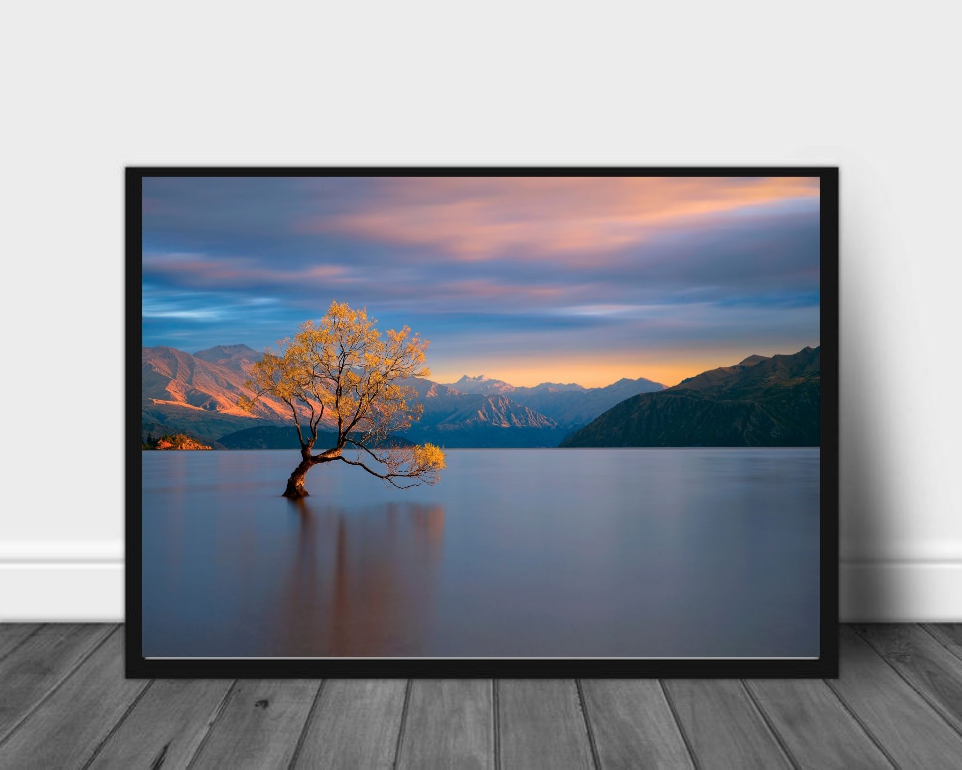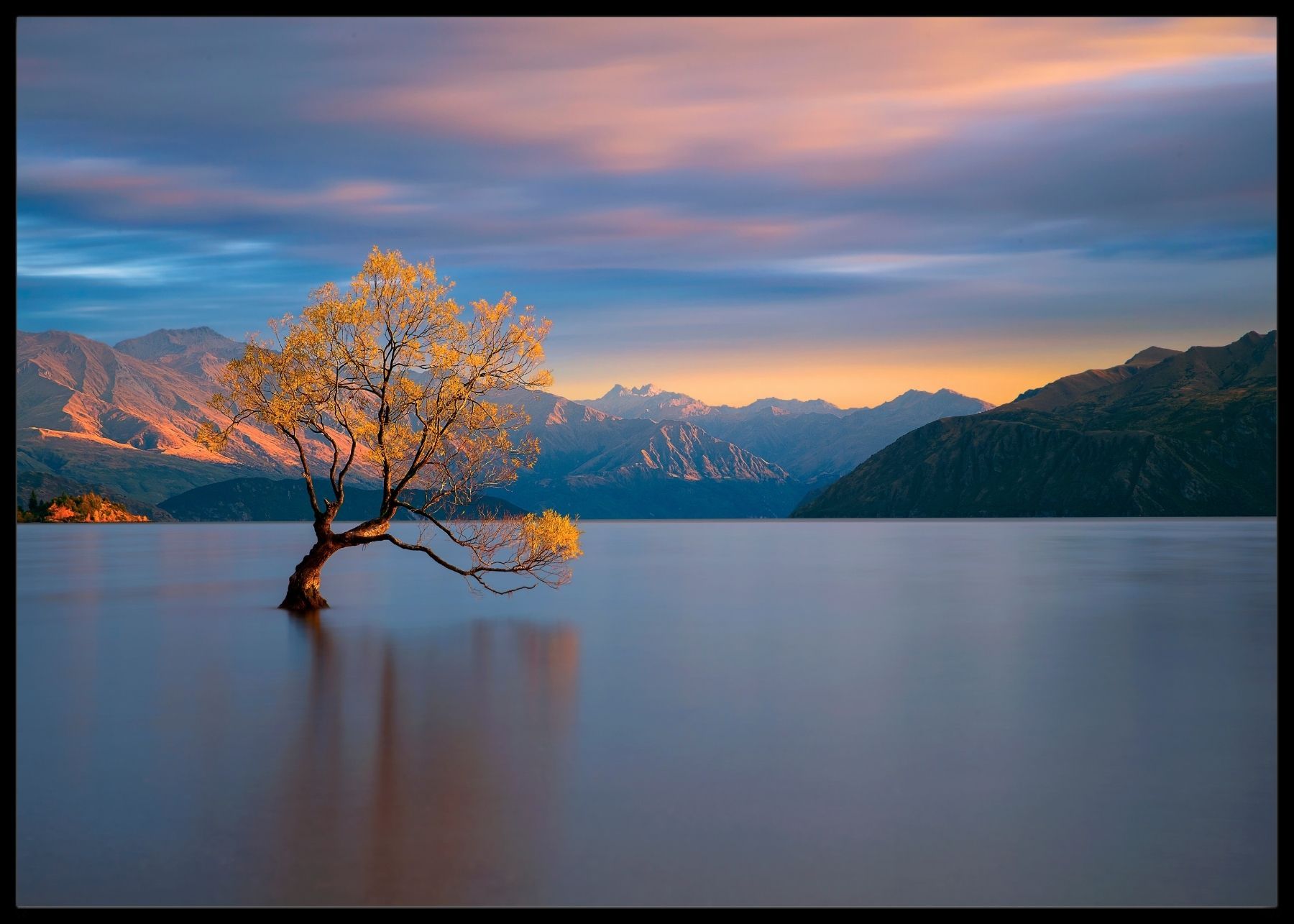 Plakat av et fantastisk landskap med gull både i sjø og på fjell.