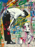 Her kan du kjøpe motivet Dad & Son som er laget blant annet med inspirasjon fra Banksy.