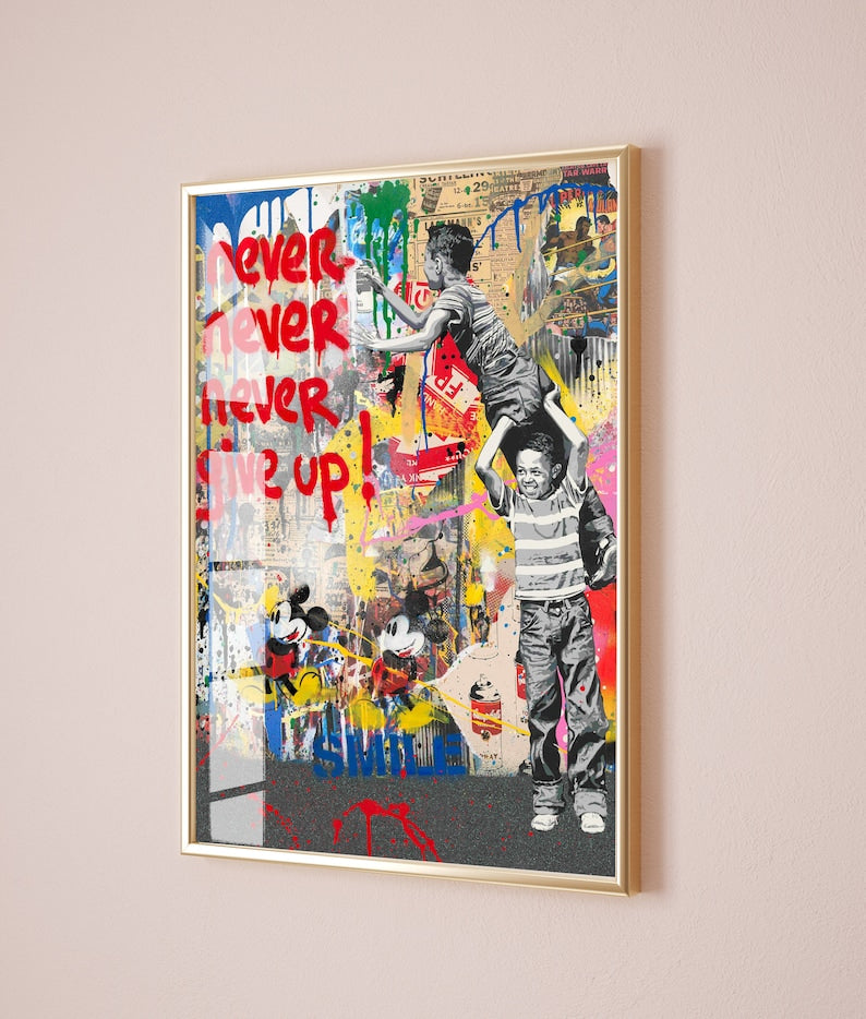 Her kan du kjøpe motivet Never Ever Give Up som er laget blant annet med inspirasjon fra Banksy.