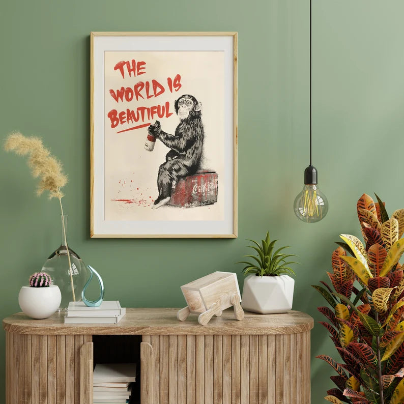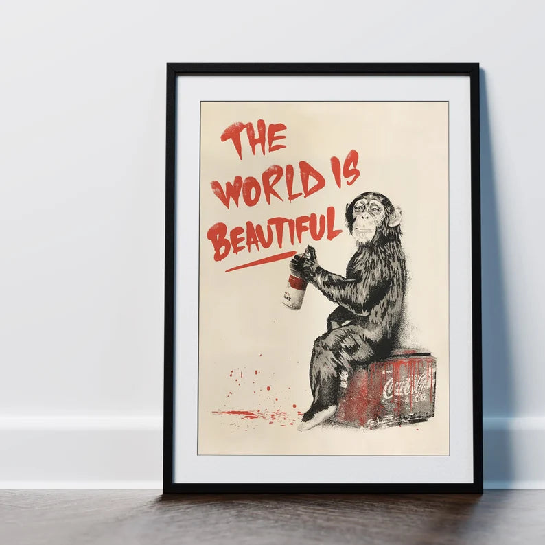 Her kan du kjøpe motivet The World is Beautiful som er laget blant annet med inspirasjon fra Banksy.