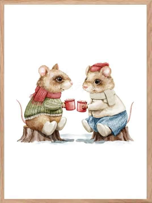En dekorativ juleplakat med motiv av mus som tar en kopp med noe varmt. Passer veldig fint på en bildevegg bestående av juleposters.