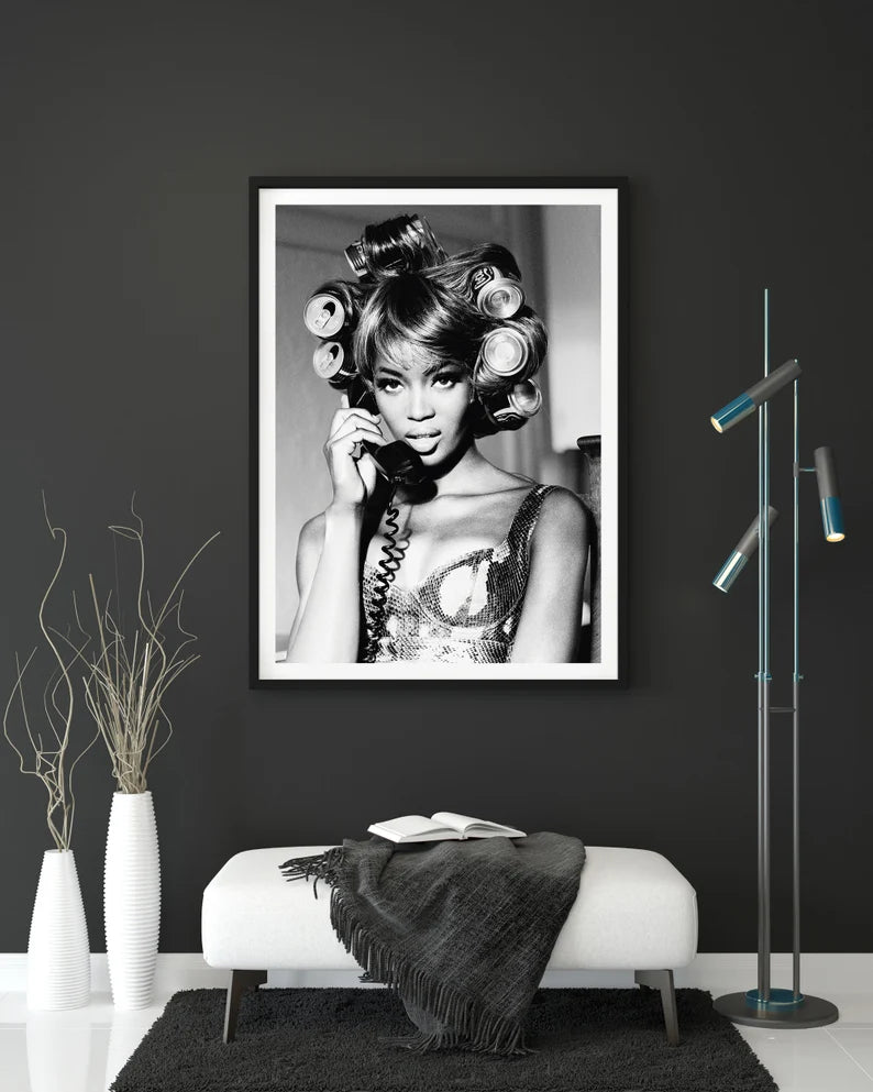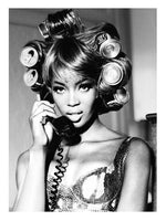 Gjør et statement med denne unike og ikoniske plakaten av supermodellen Naomi Campbell, nå tilgjengelig hos Plakatbar. Bildet, som viser Campbell i en morsom og uventet setting med håret rullet opp i brusbokser og telefonen i hånden, kombinerer høy mote med en humoristisk vri. Det sort-hvite fotografiet fremhever Campbells uanstrengte eleganse og hennes tidløse tilstedeværelse i moteverdenen.