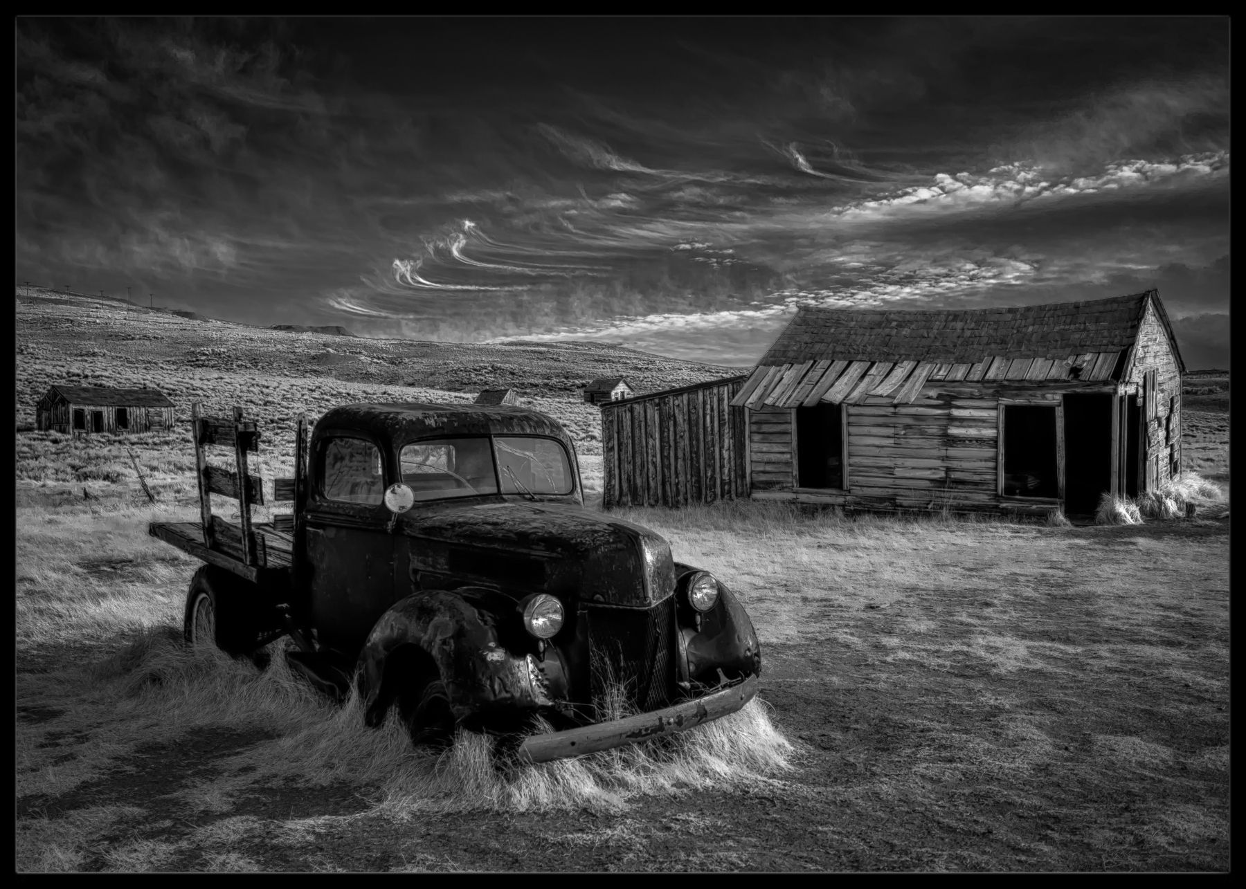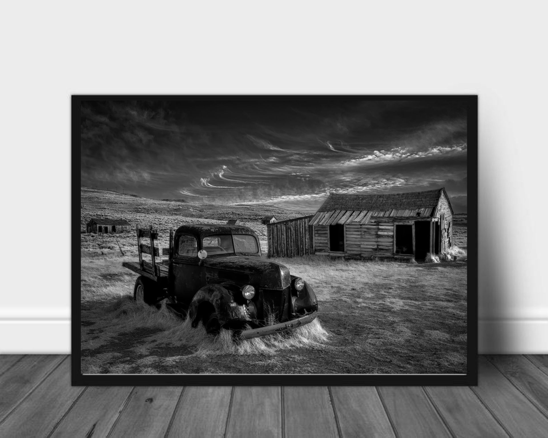 Plakat av forlatte bygninger og biler, fra California.