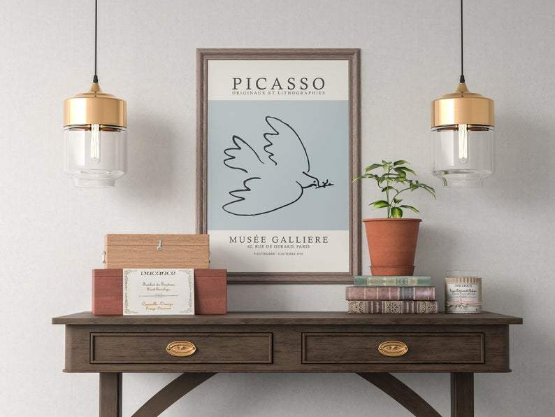 Kunstplakat med illustrasjon inspirert av den anerkjente Pablo Picasso. Nydelig sammensetning. Lag en bildevegg av våre dekorative kunstplakater! Denne illustrasjonen tar utgangspunkt i aspekter fra maleriene til Picasso og er modernisert for å passe inn i skandinaviske hjem.