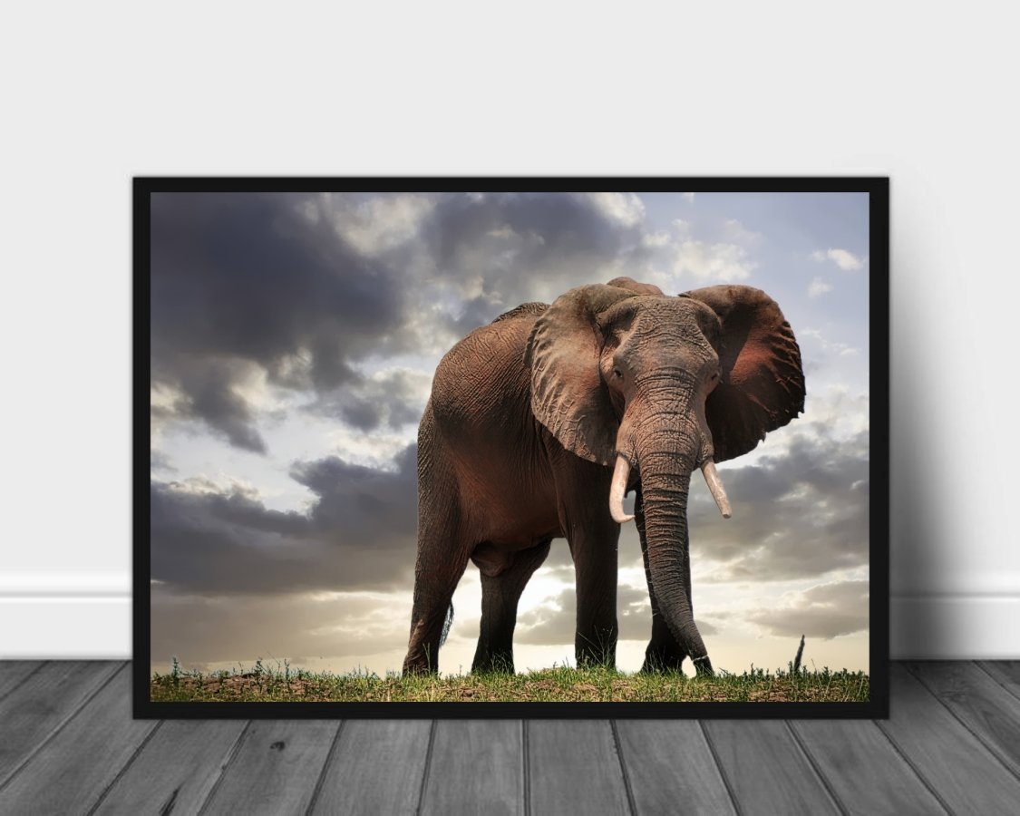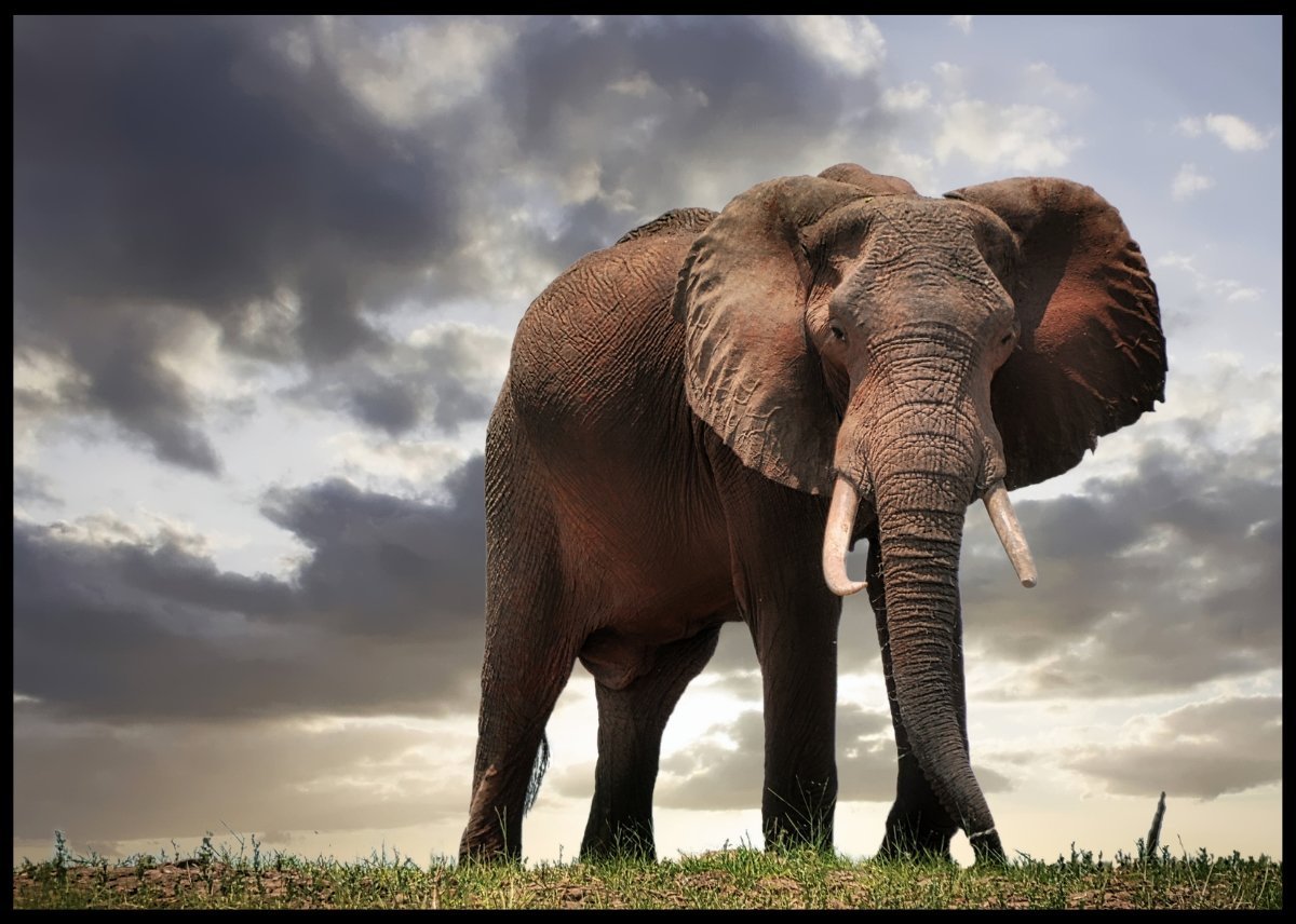 Majestetisk plakat av stor hanelefant som virker enda større fra et lavt perspektiv. Flott og dramatisk himmel som bakgrunn.