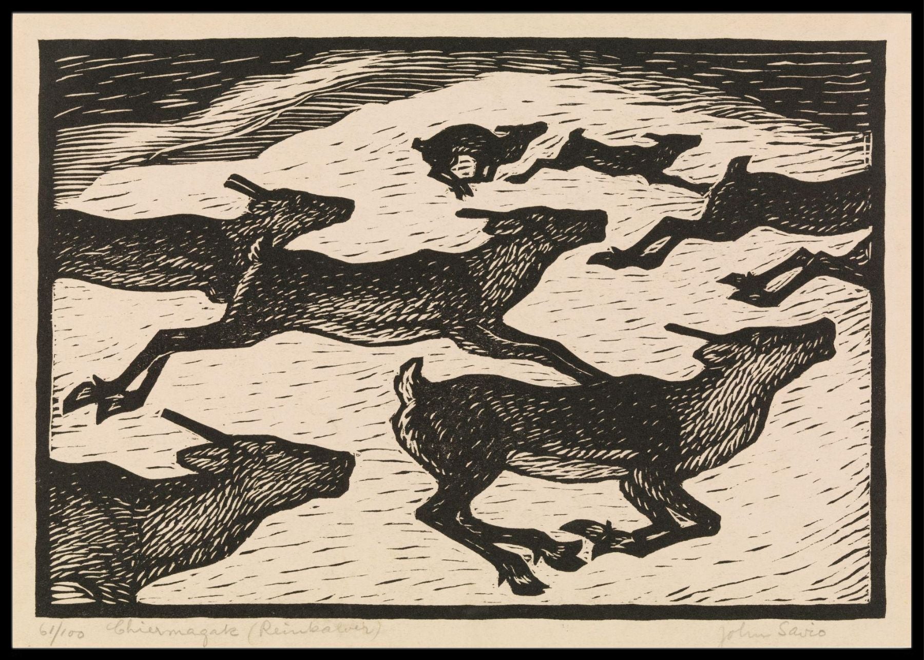 Plakat av John Savio. John Savio ble født i 1902 i Bugøyfjord i Sør-Varanger. Han døde i 1938 på Ullevål Sykehus. Han var en kjent samisk kunstner og var den første samen som fikk egen utstilling i Nasjonalgalleriet. Han arbeidet vesentlig med tresnitt, noen lino snitt og et stort antall tegninger. Mye av produksjonen hans viser livet til samene og skildrer den samiske kulturen.