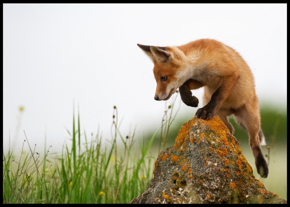 Rødrev som er på jakt, oppå en stein