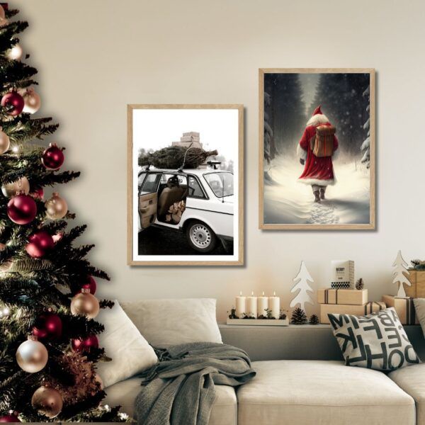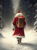 Nydelig stemningsfylt vinterbilde av julenissen som går gjennom skogen. Dette bildet kan kjøpes som plakat eller lerret.