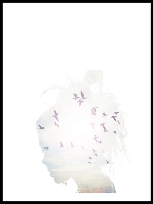 Nydelig fotokunstplakat. Motivet viser fugler som flyr på himmelen i silhuetten av et kvinnelig ansikt.