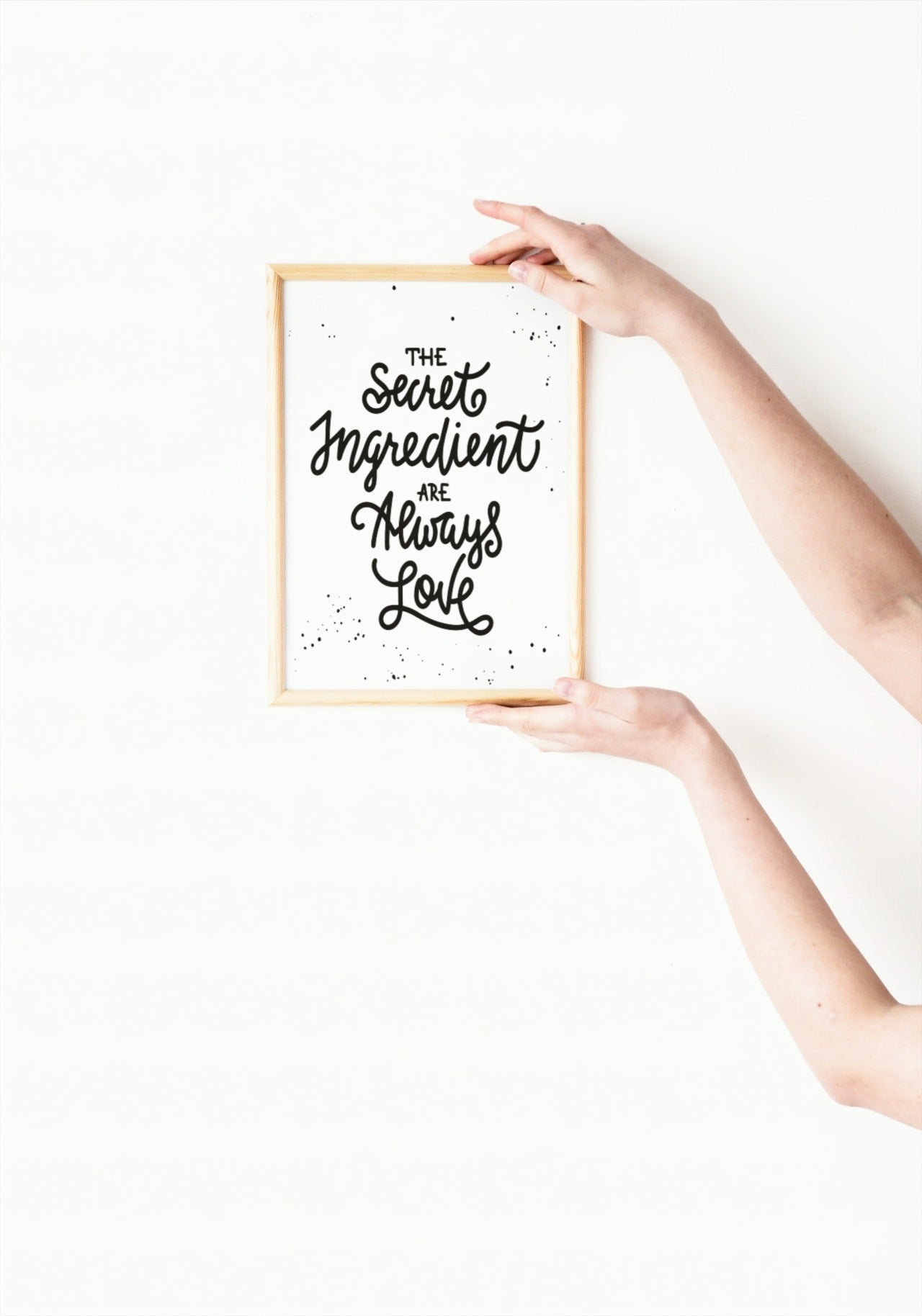 Plakat til kjøkkenet med den ikoniske teksten " the secret ingrdient are always love".  Kombiner gjerne sammen med andre kjøkkenplakater, og lag en bildevegg eller du kan sette plakatene på kjøkkenbenken.