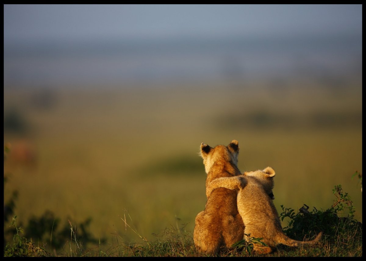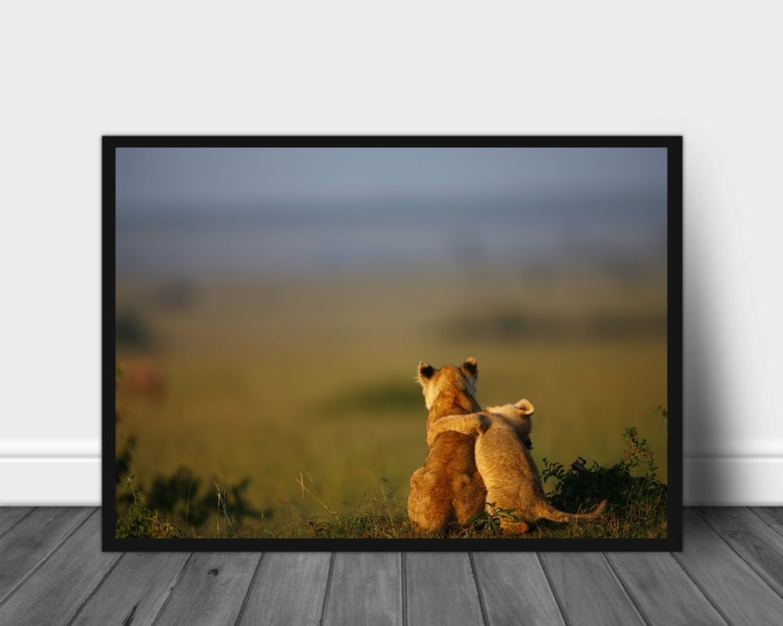 Plakat av to løveunger som speider utover sletten, og leker litt samtidig.