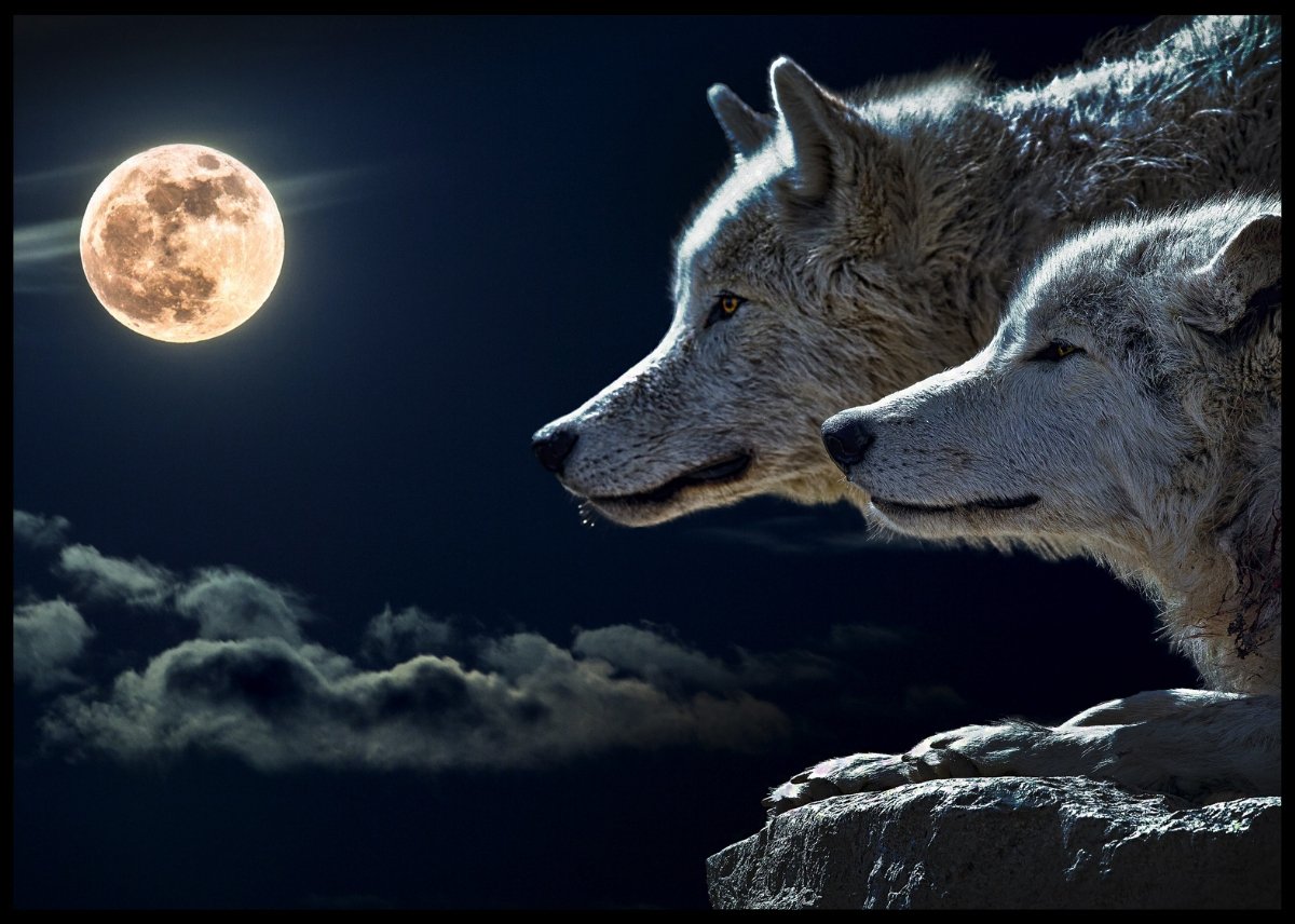 Et drømmeaktig plakat hvor to ulver ligger på toppen av fjellet og ser mot månen.