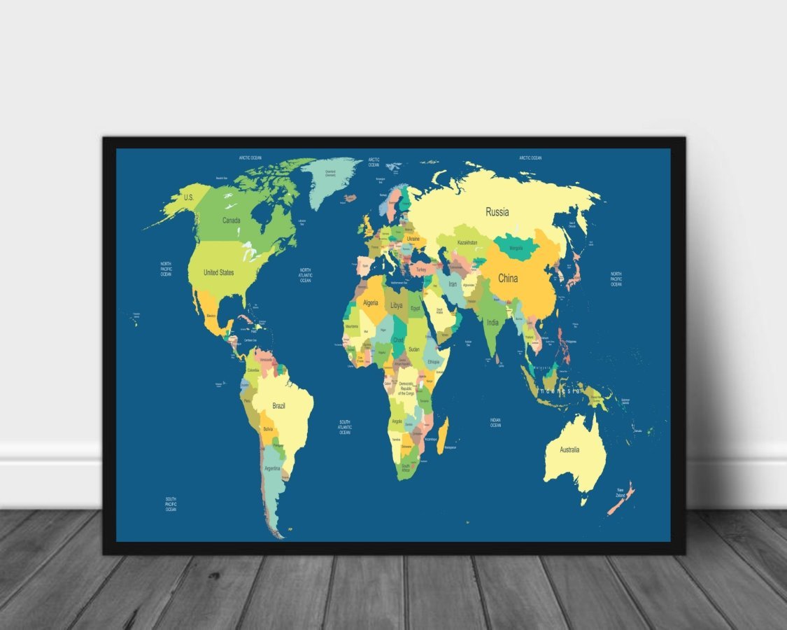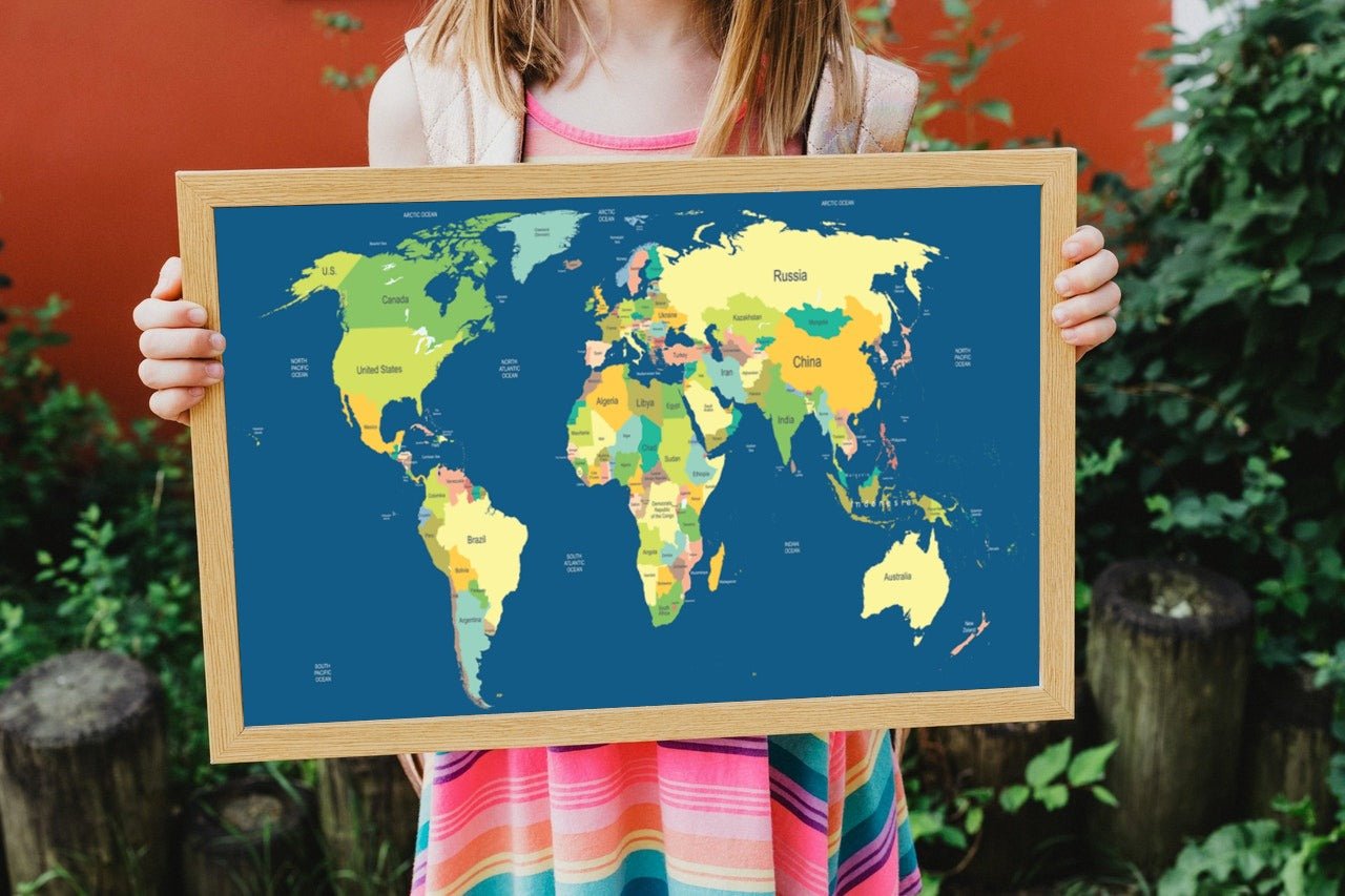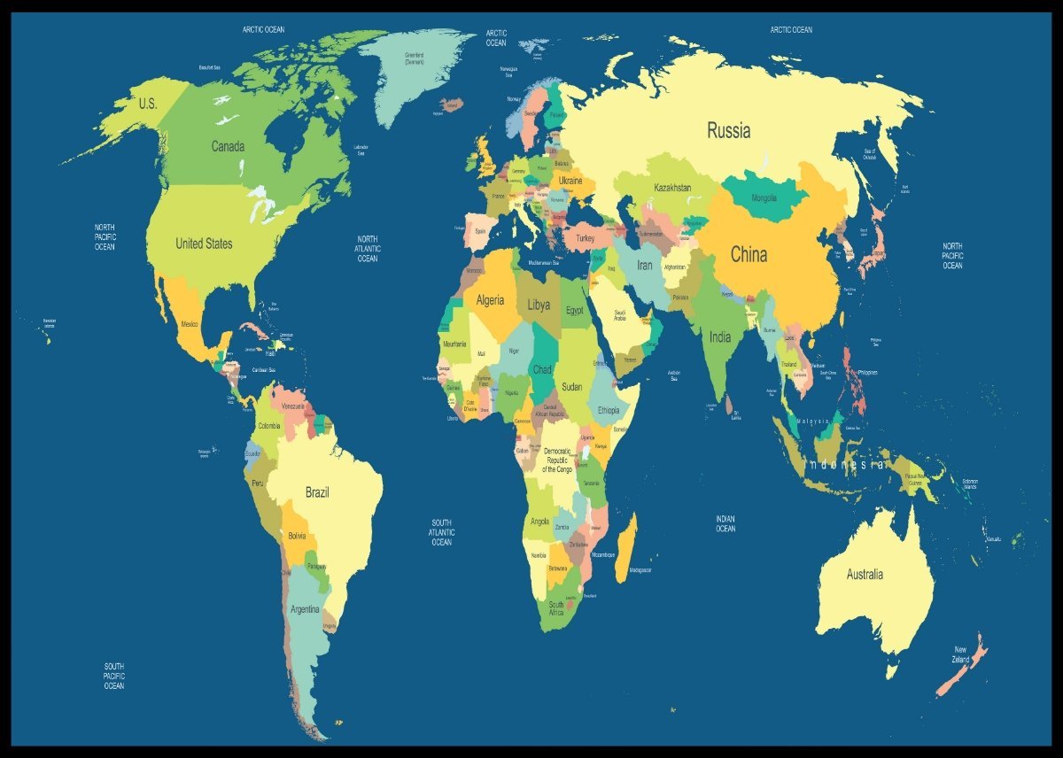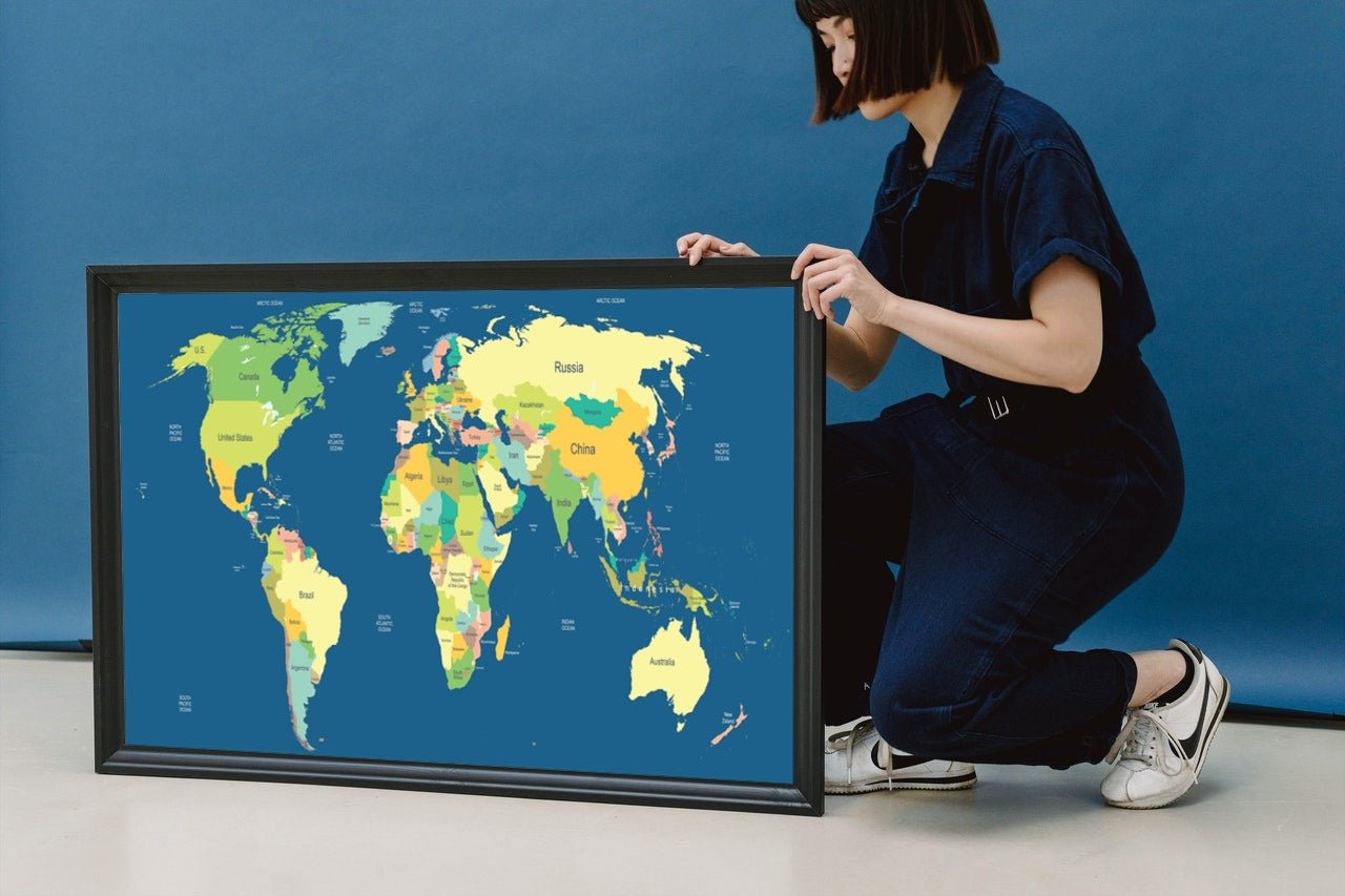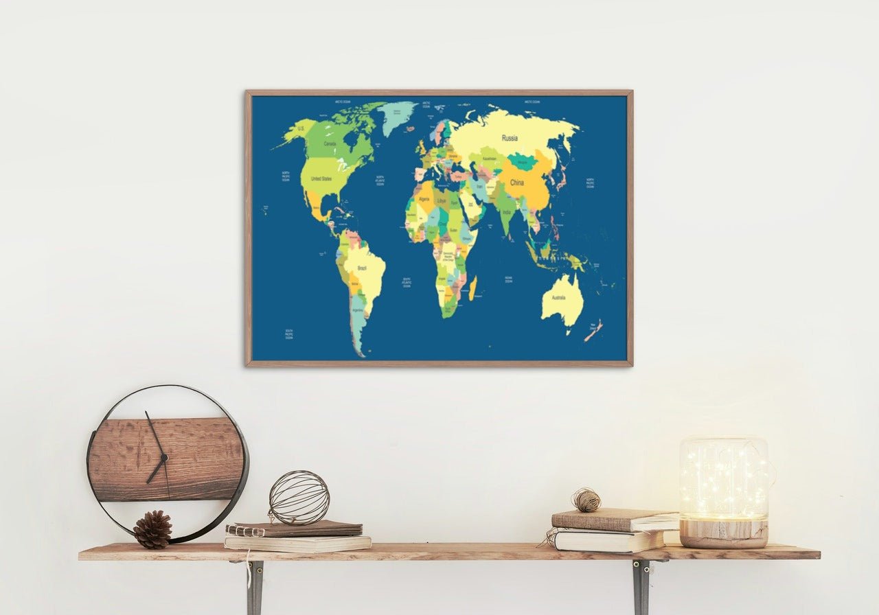Vi har mange verdenskart som du kan dekorere hjemmet, kontoret eller arbeidsplassen med. Dette verdenskartet er detaljrikt og har en mørkeblå bakgrunn.