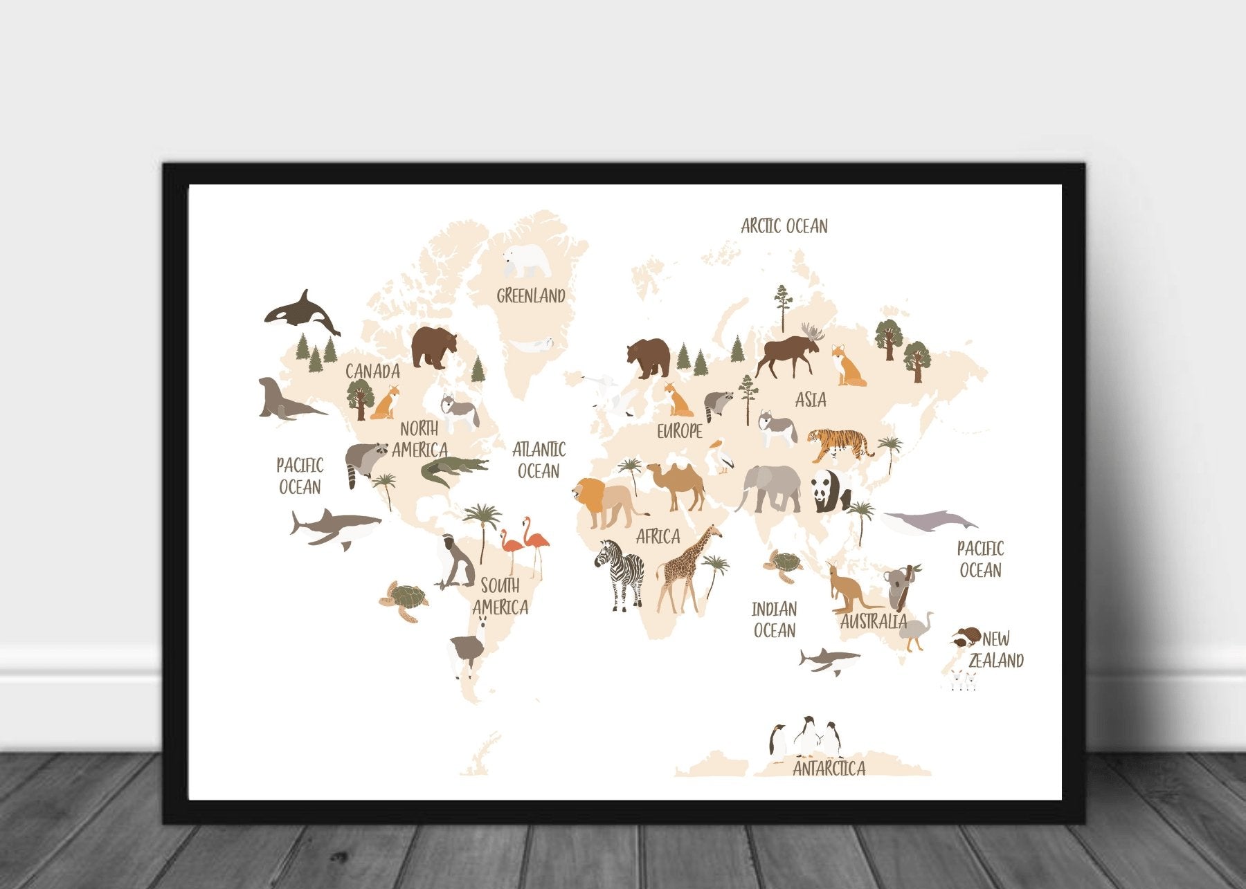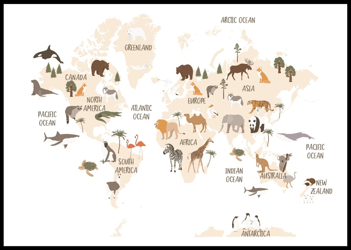 Stilig verdenskart til barn. Her kan de lære om hvordan verden ser ut med søte illustrasjoner og tegninger av dyrene som lever i de forskjellige verdensdelene.