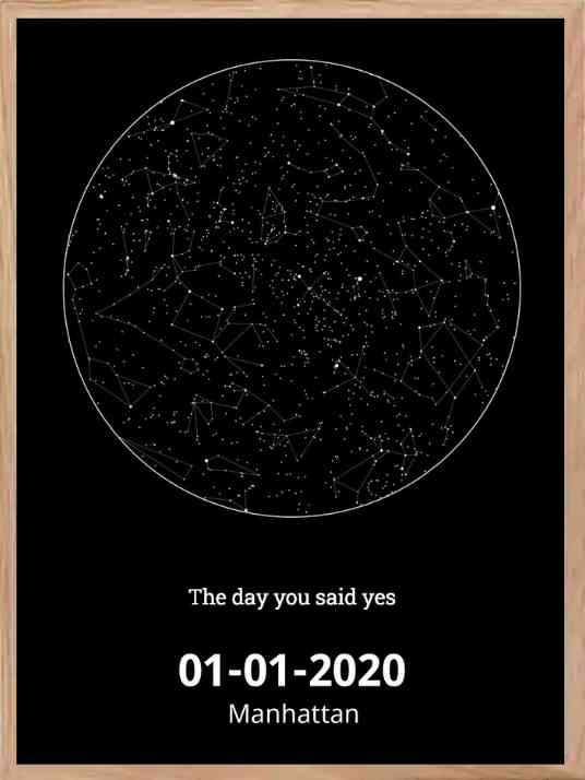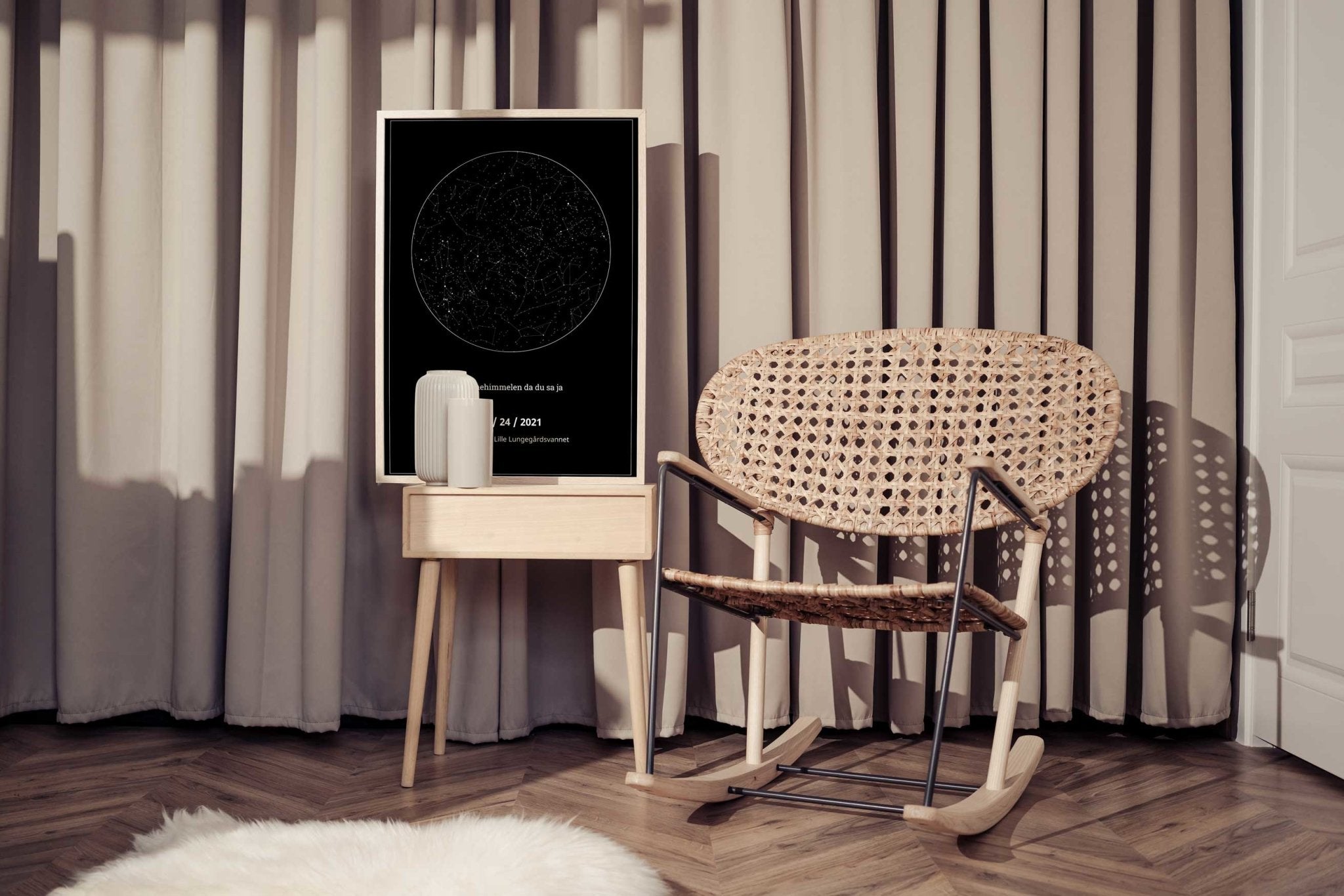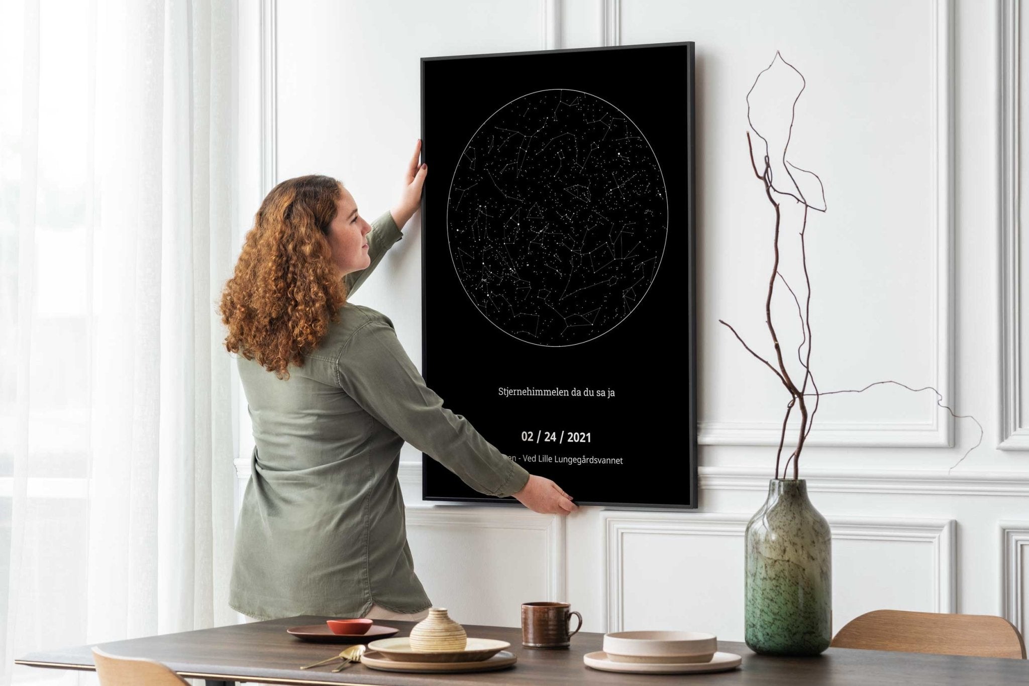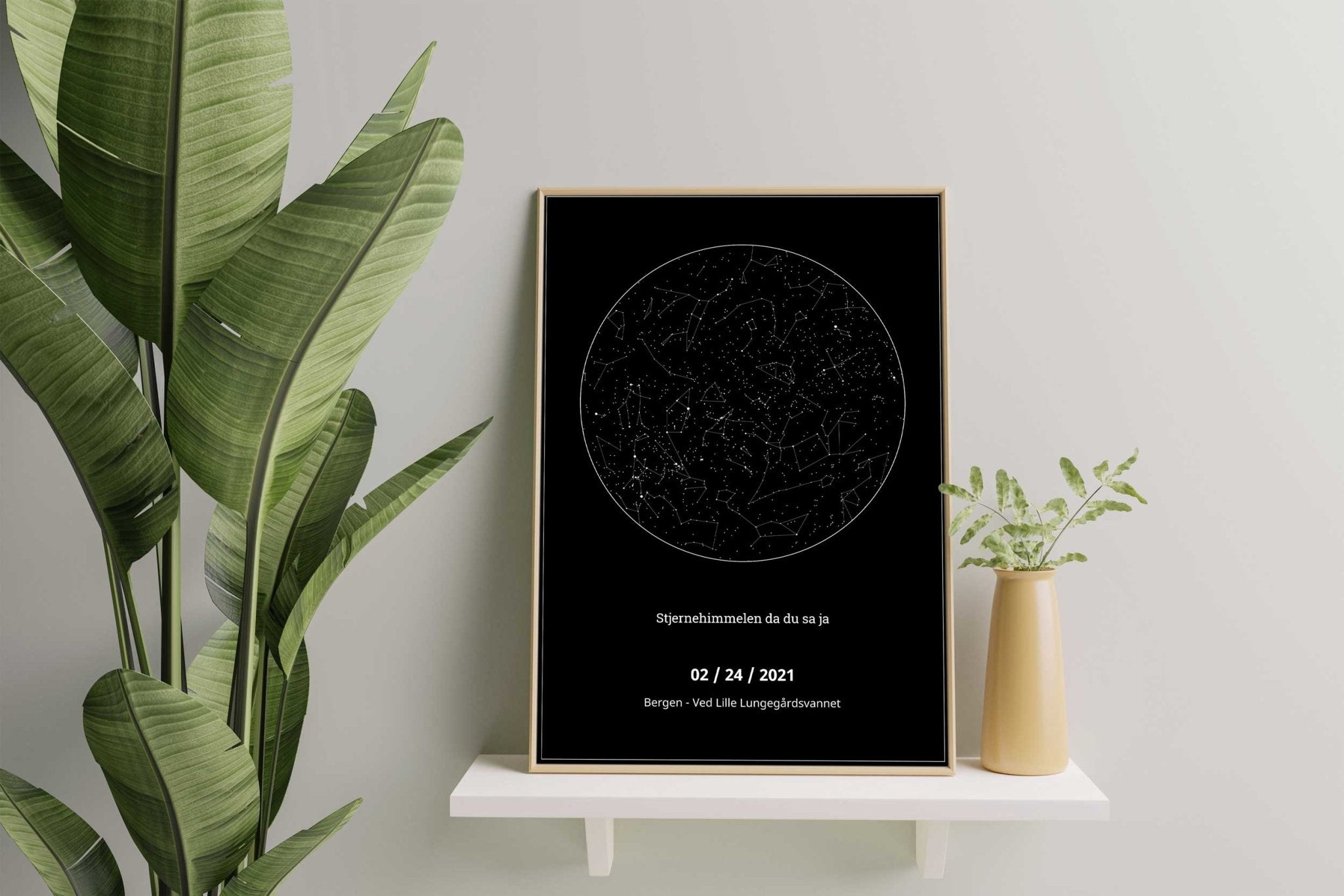 Stjerneplakatene våre er den perfekte gave eller minne om en spesiell hendelse. Ved hjelp av systemet vårt lages en plakat som viser hvordan stjernehimmelen så ut på et eksakt tidspunkt og sted. Du fyller selv inn dato og sted, og plakaten lages med akkurat den stjernehimmelen.