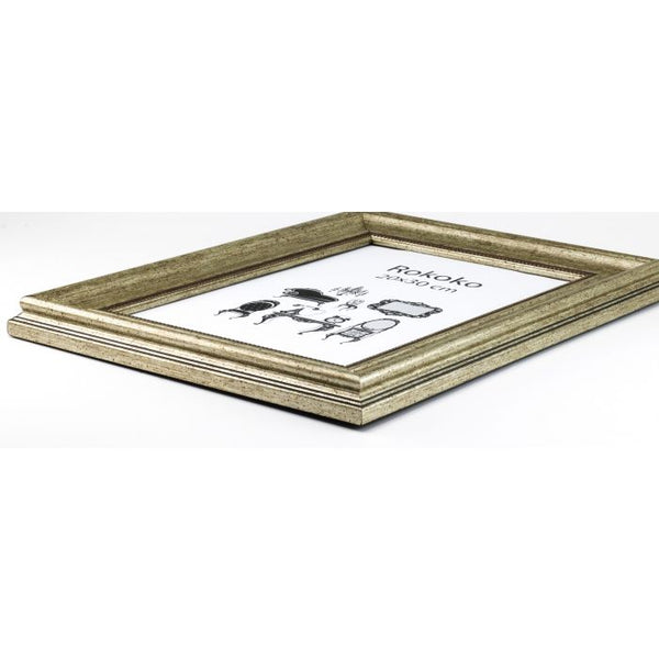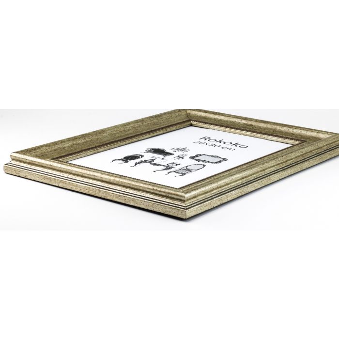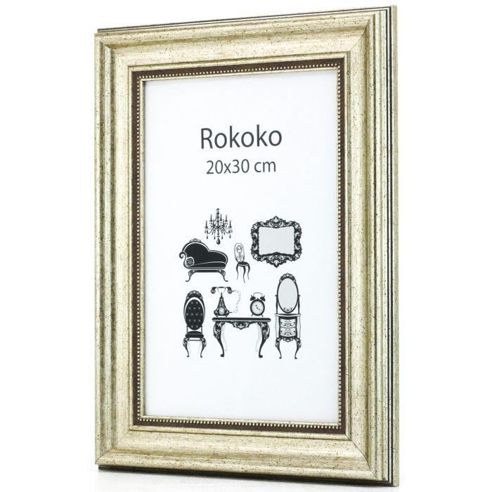 Rokokko er en flott antikk ramme som passer til mange ulike bilder og motiver. Rammen leveres både i antikk sølvl og antikk gull. Profilen er 50mm bred og 26mm dybde. Rammen er laget i robust kunststoff materiale, har ekte glass og kraftig og stabilt bakstykke, Rammen leveres i fem formater.