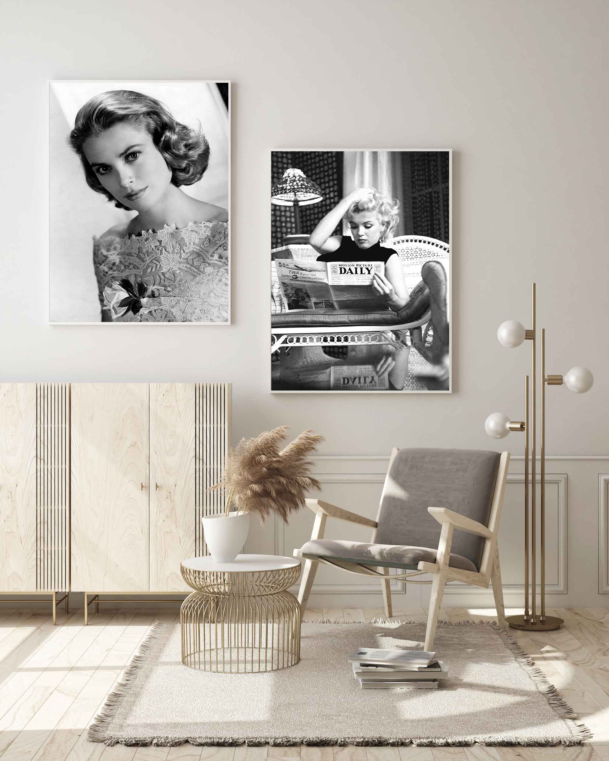 En plakat av Grace Kelly på veggen tilfører en tidløs eleganse og sofistikasjon til rommet. Som en ikonisk skuespillerinne og prinsesse av Monaco, symboliserer hun glamorøs Hollywood-stil og klassisk skjønnhet.