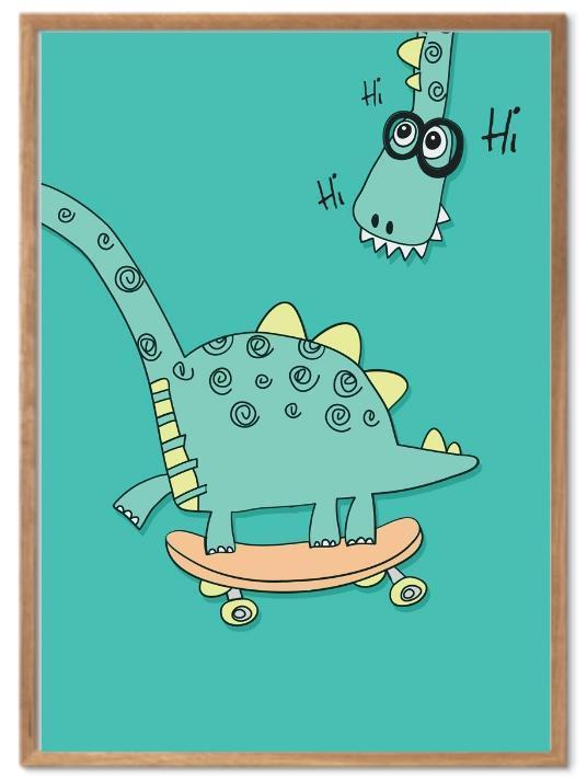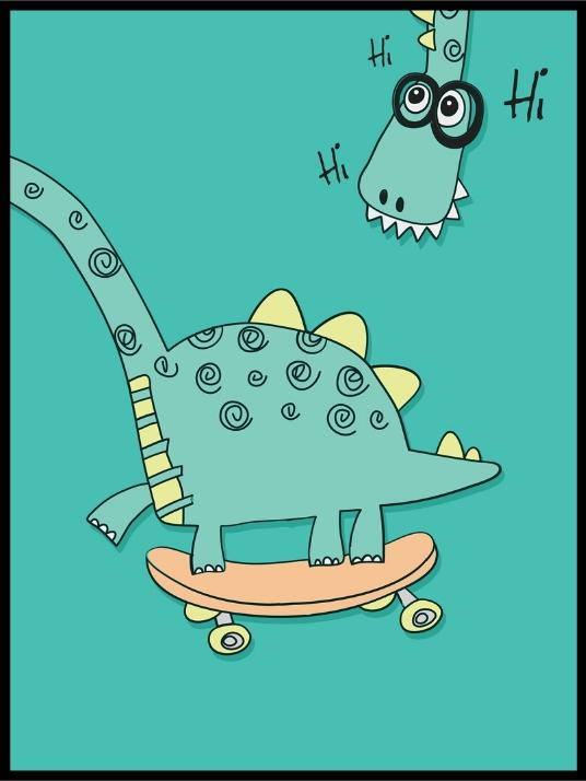 Koselig poster av en dinosaur med grønn bakgrunn.