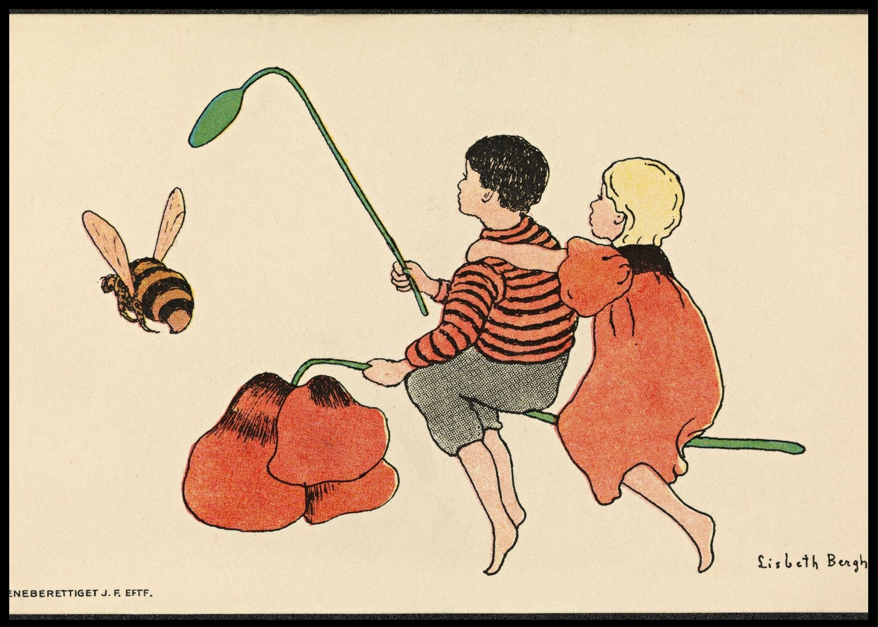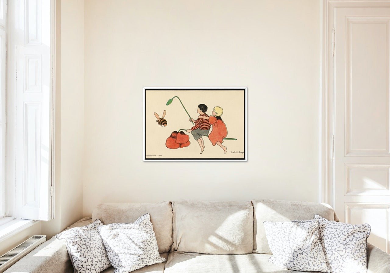 Poster av "Gutten, jenten og bien". Et motiv tegnet av Lisbeth Berg. Hun var en kjent tegner i Norge født i 1861 og døde i 1927. Hun tegnet mye og illustrerte julefortellinger, tidsskrifter og billedbøker.