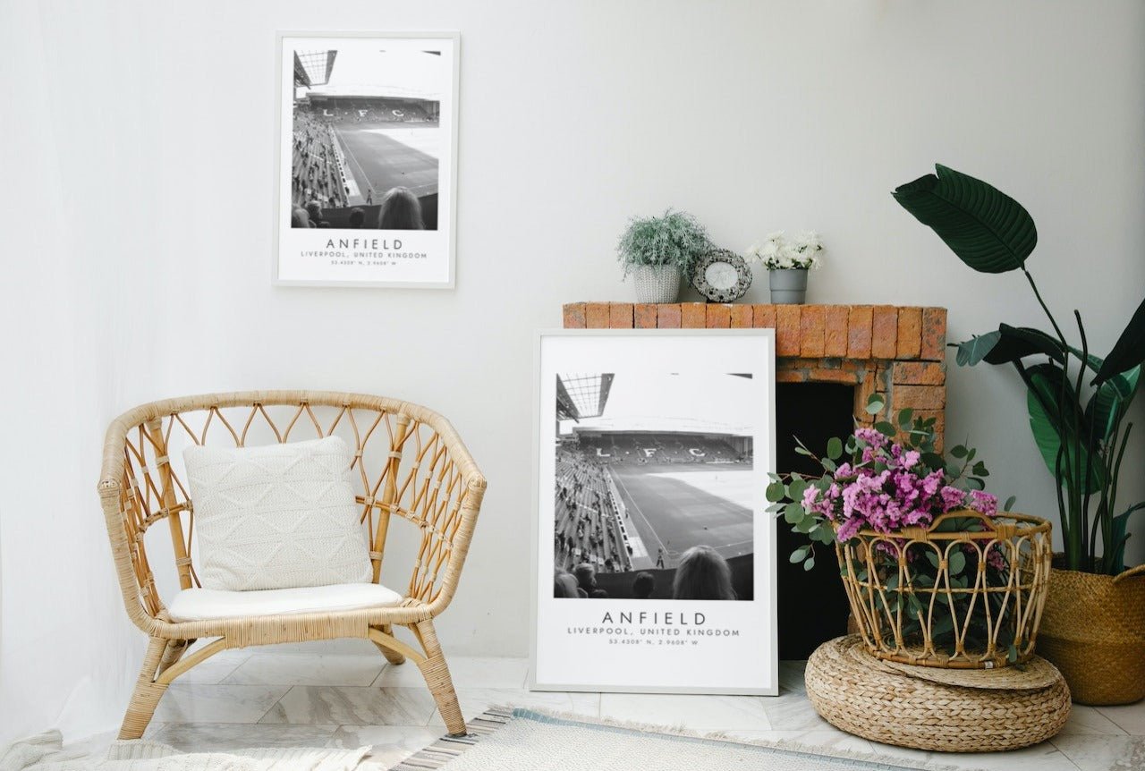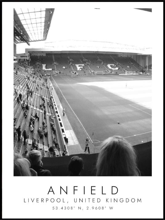 Fin sort/hvitt plakat av hjemmebanen til Liverpool, Anfield.