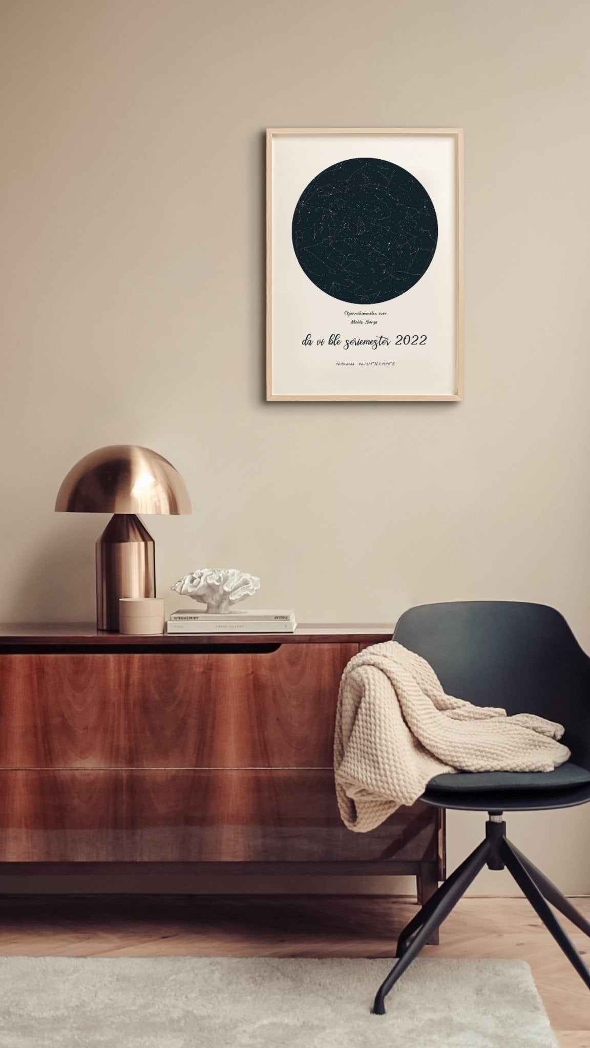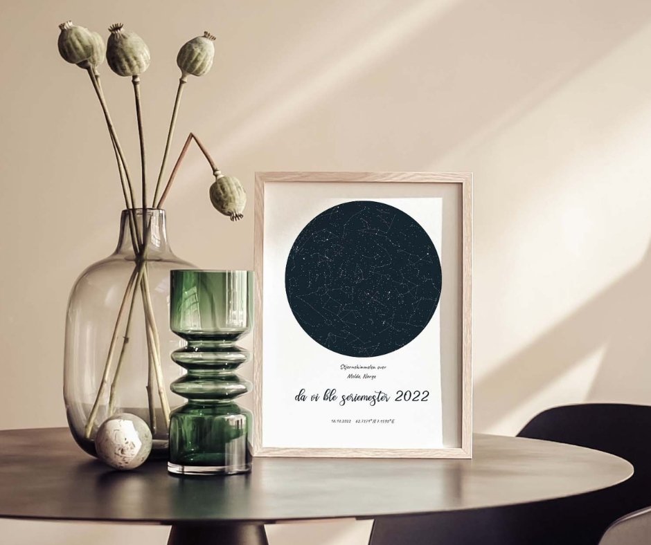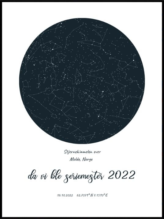 En unik plakat som viser stjernehimmelen over Molde by 16.10.2022 - datoen da Molde fotballklubb vant eliteserien for femte gang.