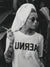 Kvinne med sigarett og t-skjorte med teksten "Aernu".