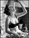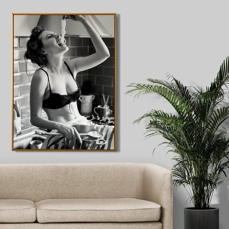 Ikonisk plakat i sort/hvitt av spagettispisende kvinne.