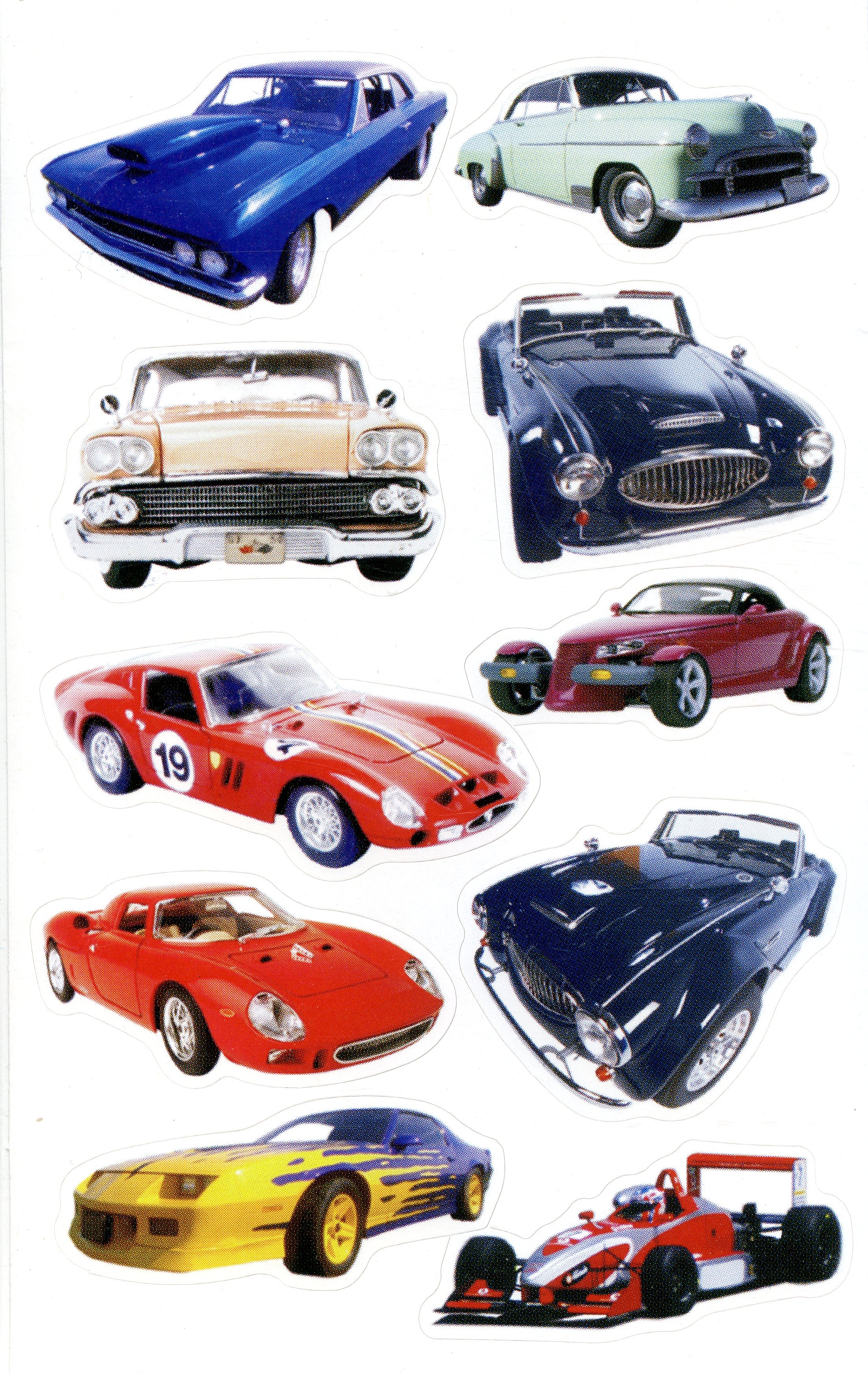 3 brett med stickers, Biler. Glimrende til dekorasjoner, kort , album etc.